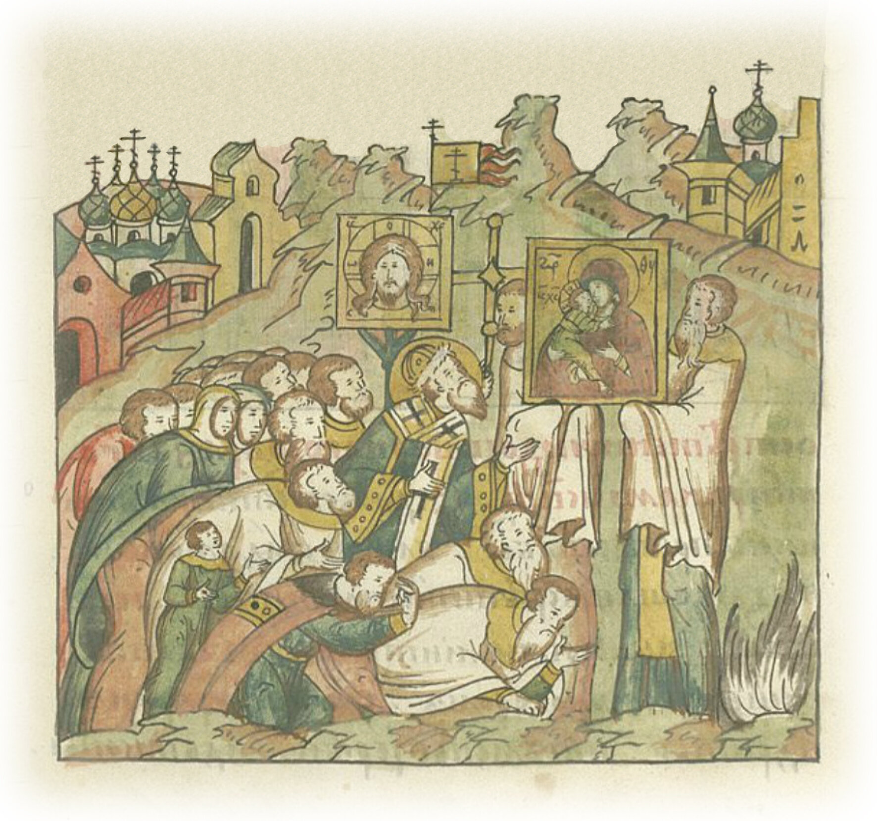 О всенародном молении с благой надеждой перед образом Богоматери. И встретили ее далеко за городом. И когда узрели пречудный образ Богоматери и на пречистых ее руках пречистый образ Исуса Христа, все пали на землю ниц, обливаясь слезами, вздыхая и прилежно молясь.