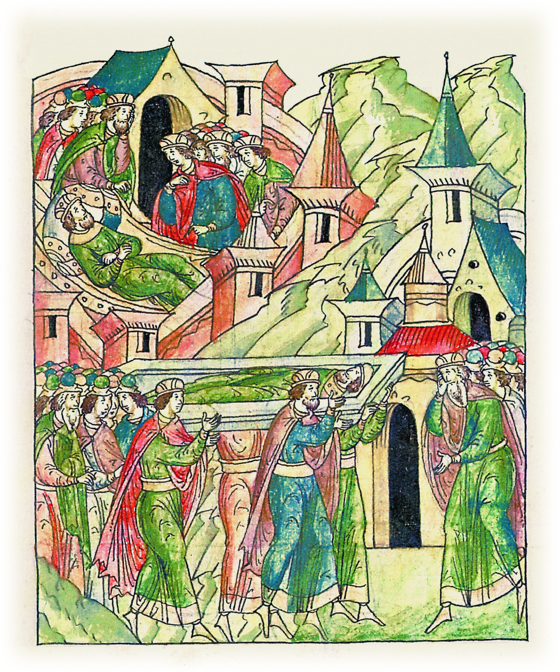 Кончина князя Иванка Юрьевича, внука Владимира Мономаха, у князя Святослава Олеговича на устье Протвы-реки в Любинце Амосове. Его братья Борис и Глеб Юрьевичи несут его тело к отцу, Юрию Владимировичу Мономаху, в Суздаль.