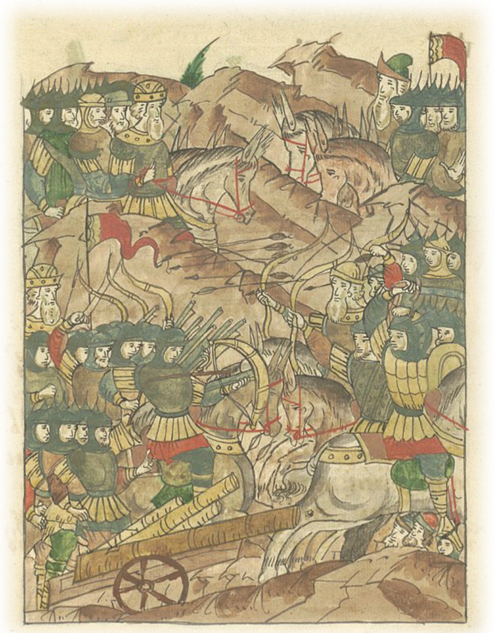 И страшно было видеть обе силы, готовящиеся к кровопролитию и смерти. Прежде всех выступил со своим войском великий князь Ордынский Едыгей и стал сражаться с Витовтом, стреляли татары и литва из самострелов и пищалей. Но в чистом поле пушки и пищали наносят мало вреда противнику, и хотя и наносили они мало вреда, отважно билась литва, сыпались стрелы, как дождь.