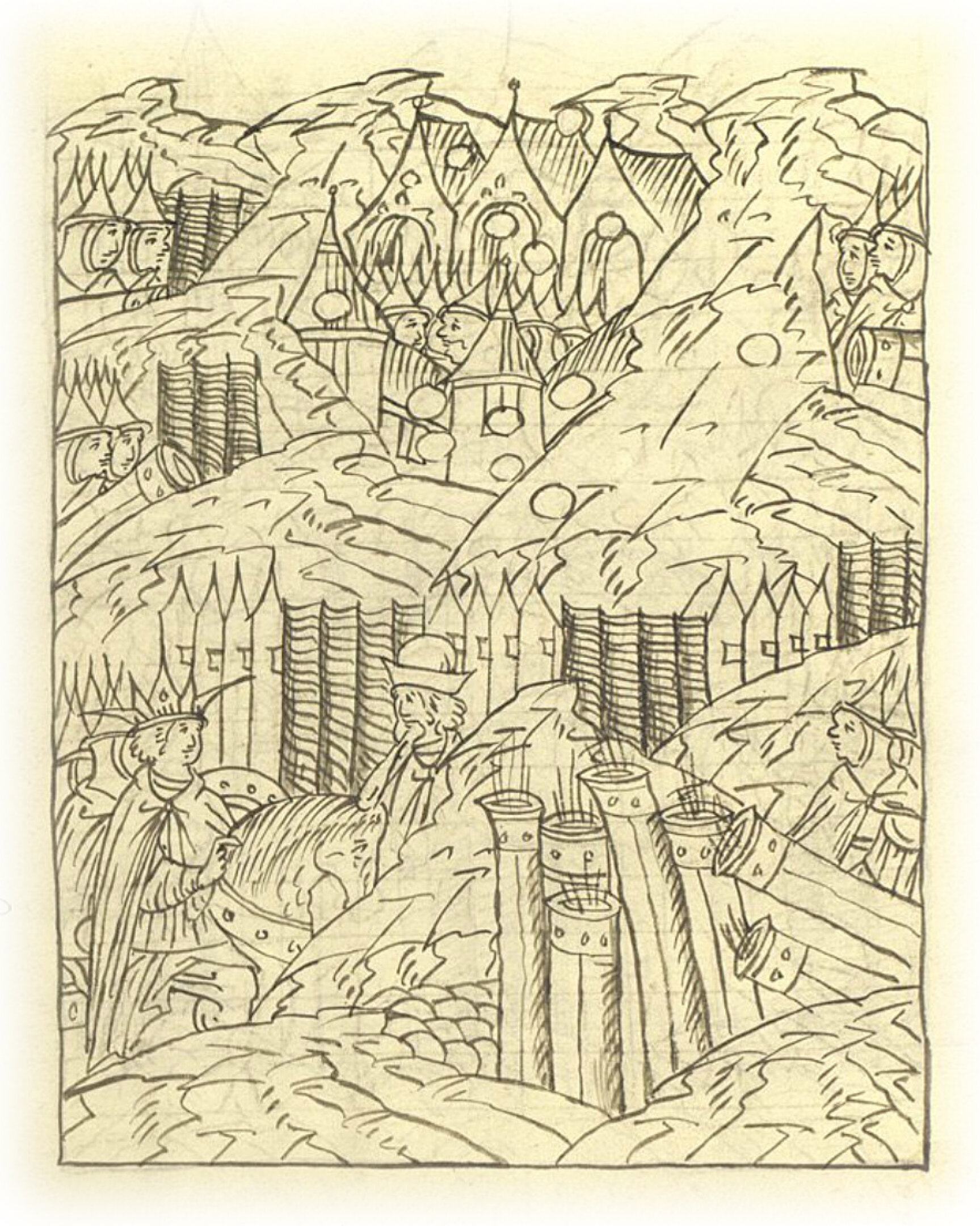 Языки говорят воеводам царя Ивана Васильевича, что магистр окопался большим рвом вокруг города Рындола, бьет из пушек и пищалей и приступает к Рындолу.