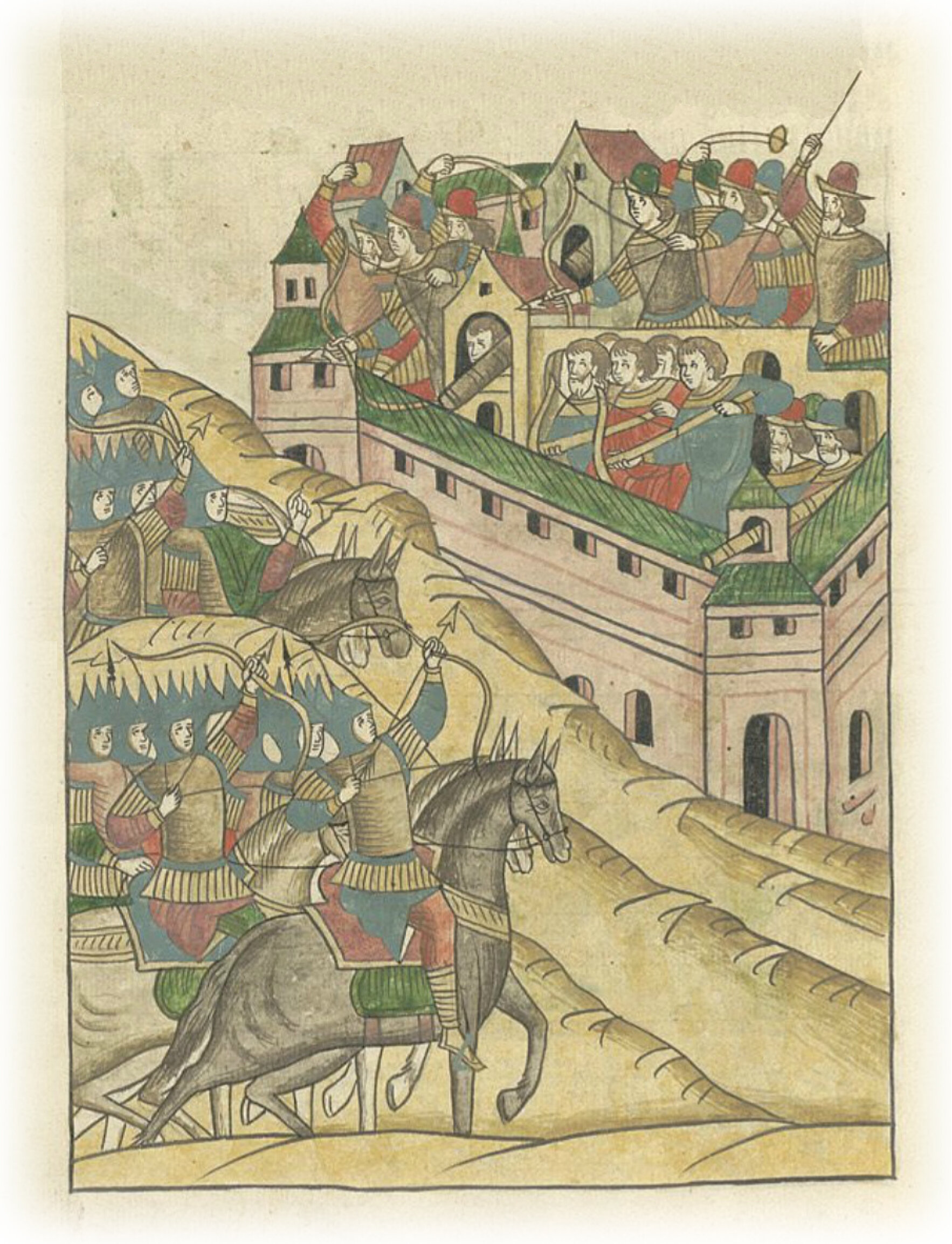 И снова иные приступили, свирепейшие и лютейшие; горожане же против них сражались, стреляя, и камнями сшибая, и самострелы напрягая, и осадные орудия, и тюфяки. Были и некоторые, которые даже пушками стреляли в них.
