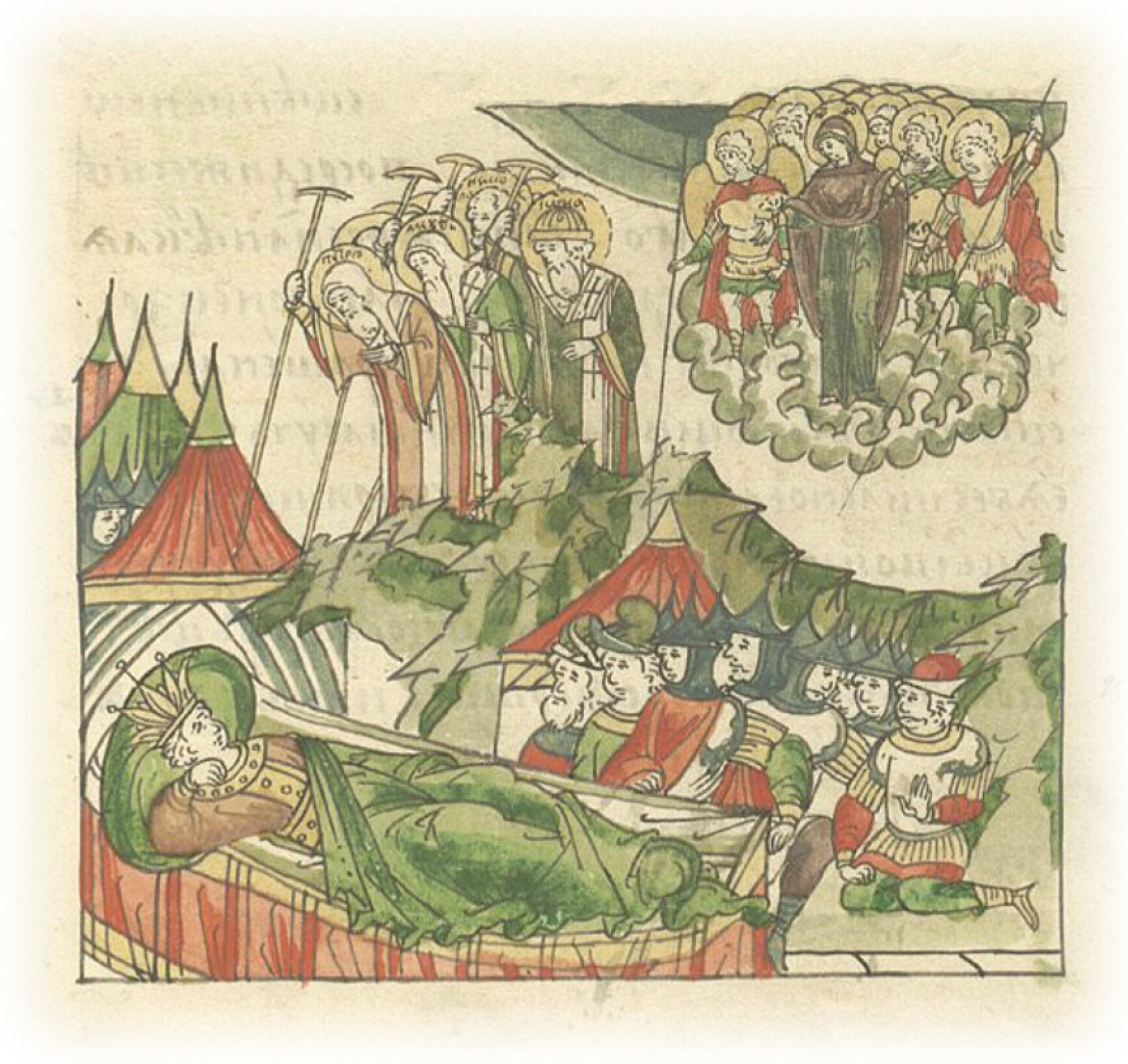 Об устрашении царя Темир-Аксака видением. О, преславное чудо, братья! О, превеликое удивление! В тот самый день и час, когда вышло всенародное множество навстречу божественной той иконе, которые со слезами восклицали к Богу и к Богородице, молясь об избавлении от нашествия нечестивых, в тот же самый час возгордившийся мучитель Темир-Аксак видел необычное видение, которое наполнило его ужасом. Было так: он возлежал на своей постели и спал. И видит страшный сон: привиделась ему превысокая гора, и поверх горы идут к нему святители, держащие в руках своих золотые жезлы, и грозят ему. И внезапно он увидел над святителями в воздухе необычно сияющий, несказанный свет. Посреди того яркого света явилась некая жена, в багряные ризы одетая и украшенная неизреченною славою и благолепием, и светом сияя, ярче, чем солнечные лучи. Вокруг Нее бесчисленное множество страшных и великих пресветлых воинов, служащих Ей как царице. Эта жена, стоя, руки свои простерла в высоту и молилась о ком-то, Темир-Аксаку же люто грозила.
