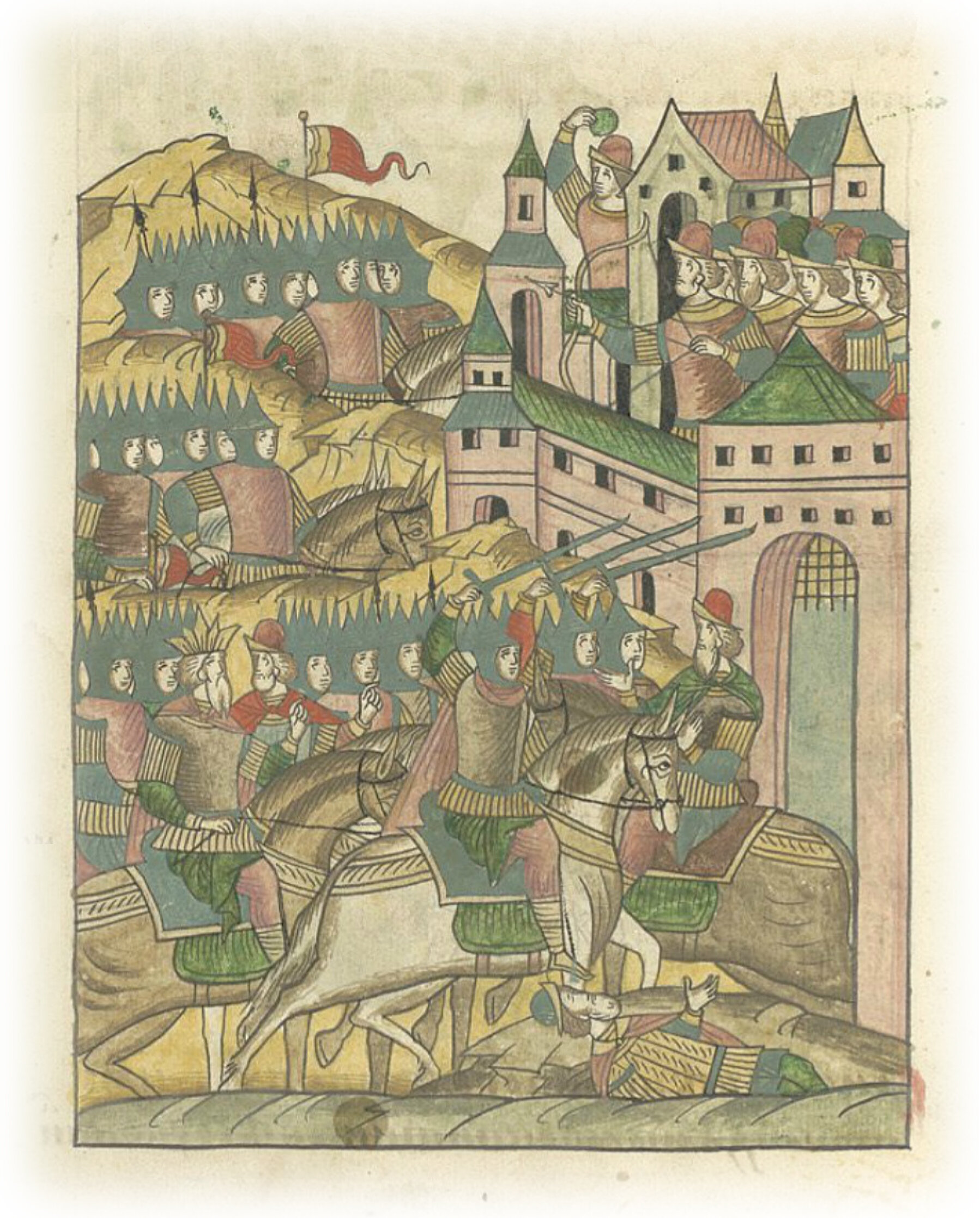Простояв под Москвой три дня, царь Тохтамыш лживыми обещаниями о мире выманивает Литовского князя Остея из города и убивает его.