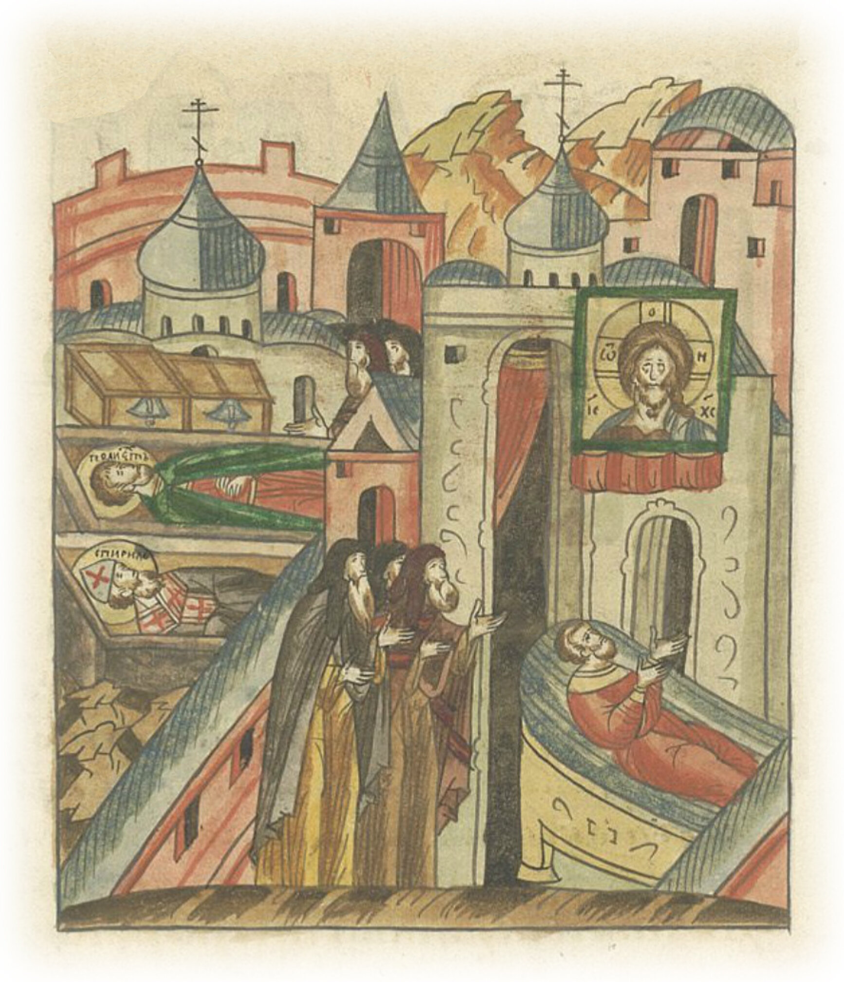 Также видели в той же стороне церковь малую, в которой образ Спасов великий, от него же изошел глас прощения на одре лежащему человеку и верою кающемуся о своих грехах. Также видели там же в приделе святого Спиридона епископа и Полиевкта, оба в теле, многие чудеса источающие, и мощи святого Иоанна Златоустого, и мощи святого Григория Богослова патриарха, в каменных ковчегах запечатанные.