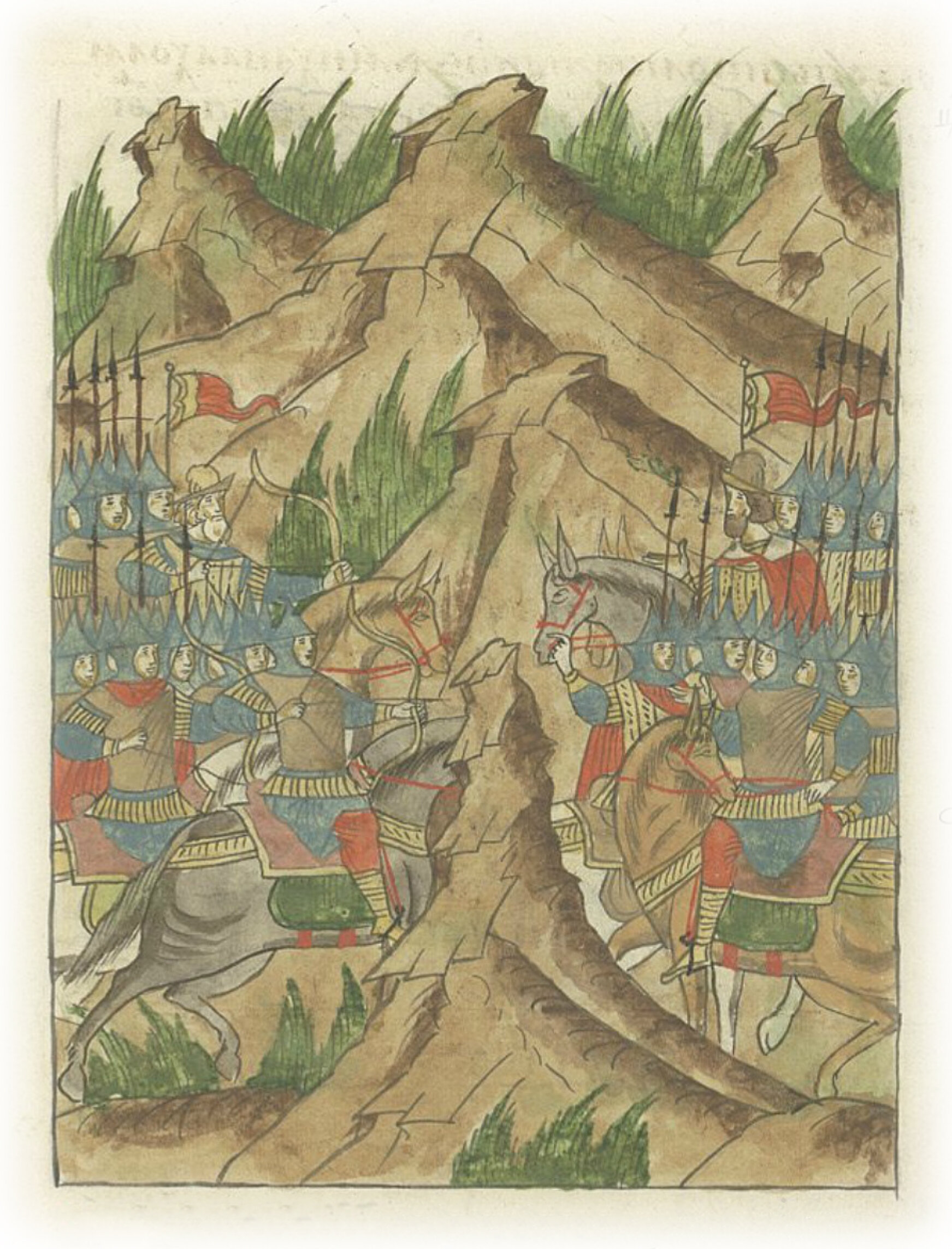 Увидев же это, новгородцы взволновались и заколебались, как пьяные; а они поспешили напасть на них, начав прежде них стрелять,