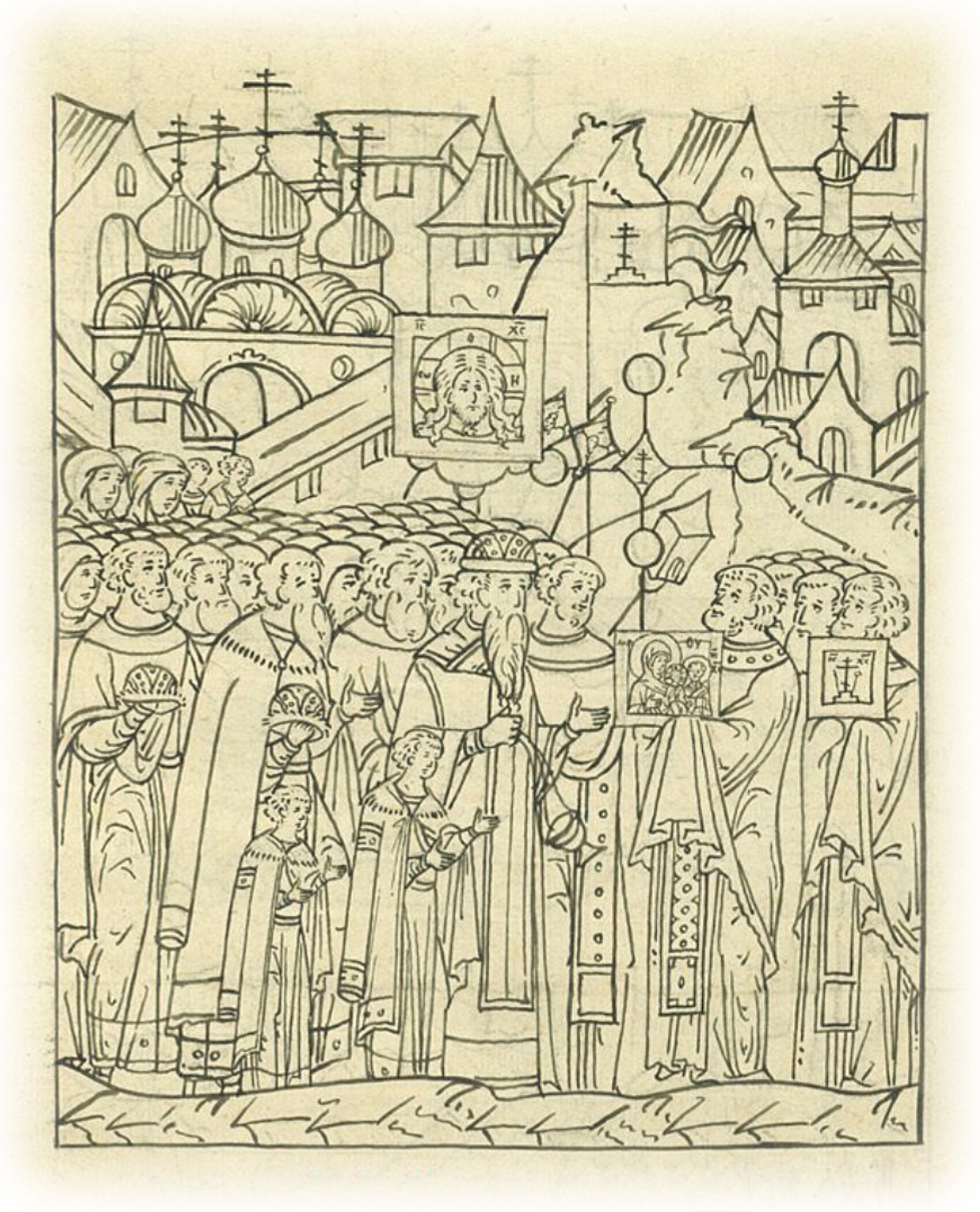 В 7048 (1540) году в феврале в 3 день принесены были из Ржева в Москву две иконы чудотворные: образ Пречистой Одигитрии, а другая икона – Крест честной. И встретили чудотворные иконы с крестами преосвященный Иоасаф митрополит со всем освященным собором и князь великий Иван Васильевич всея Руси с братом своим с князем Юрием и с боярами, и со всем народом близ Нового монастыря митрополичьего.