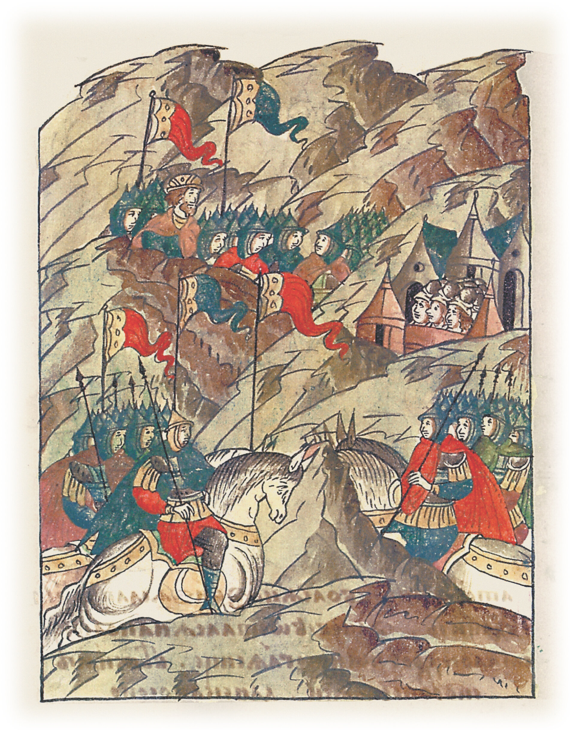 Воеводы царя Ивана Васильевича, разделившись, идут в погоню за царем Емгурчеем.