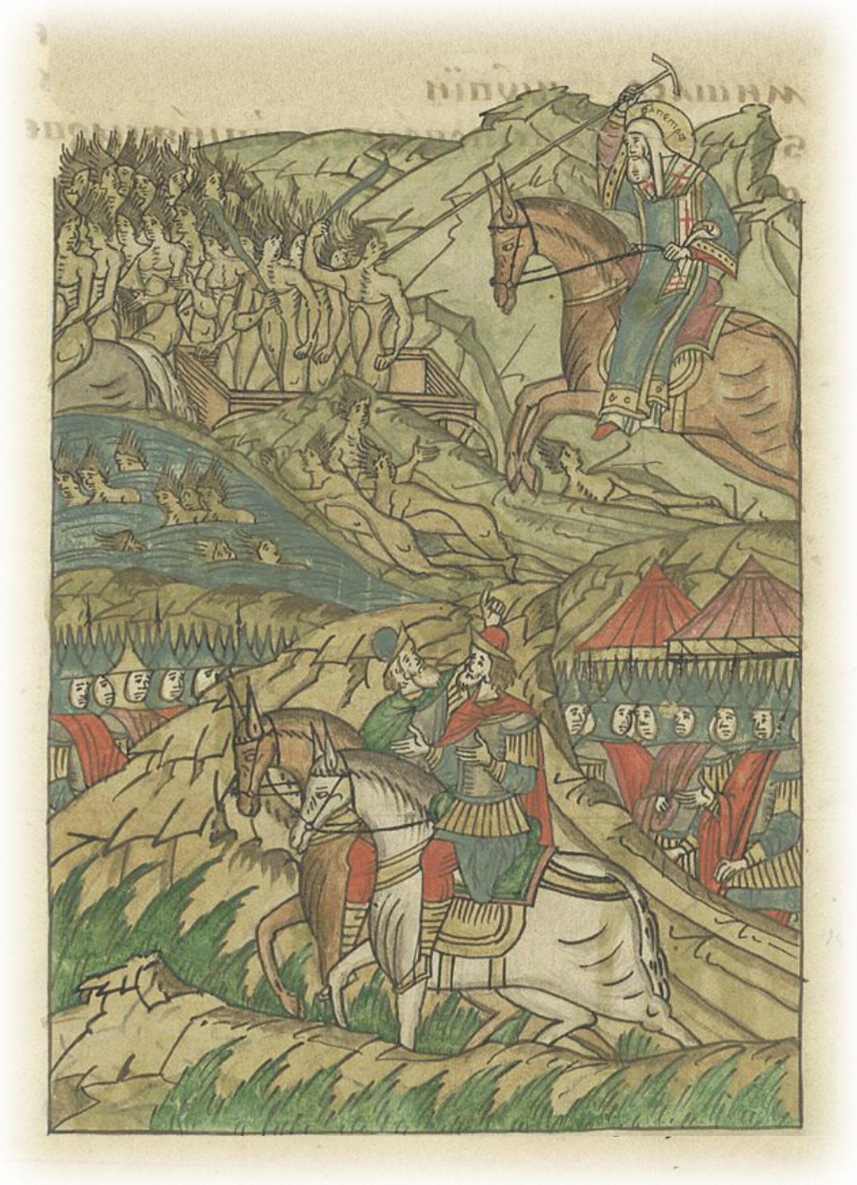 И тут внезапно явился святой Петр, митрополит всея Руси, имея в руке жезл золотой, и пришел на них с яростью великою, глаголя: «Почто пришли погубить мое стадо, которое мне даровал Бог охранять?» И начал жезлом своим их прокалывать, одни же на бег устремились, и другие убежали, иные же в водах утонули, некоторые же раненые лежали.
