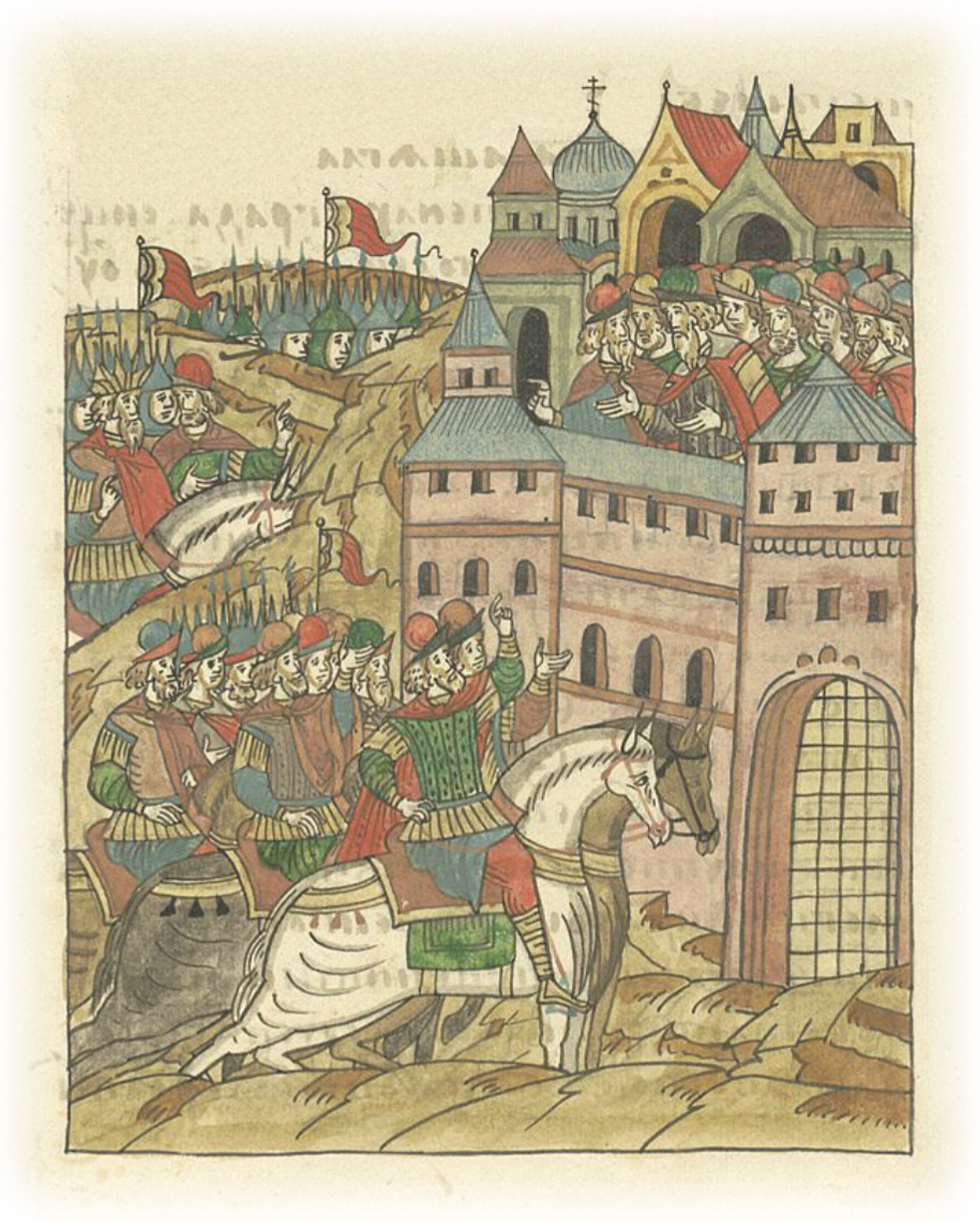 Ордынские князья вместе с князьями Василием и Семеном, сыновьями великого князя Дмитрия Константиновича Суздальского, встают под стены Москвы и говорят бывшим на стенах горожанам, что царь хочет их миловать, потому что пришел не на них, а на великого княз