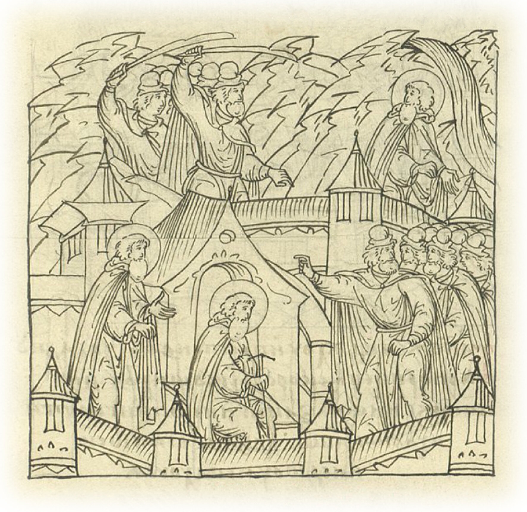 Знамение в городе Казани. Много раз видели татары на царском дворе и в царских горницах ходящего человека черноризца, иногда же сидящего, и всячески пытались его убить; он же посреди них ходил из города к реке Волге и невидим становился.