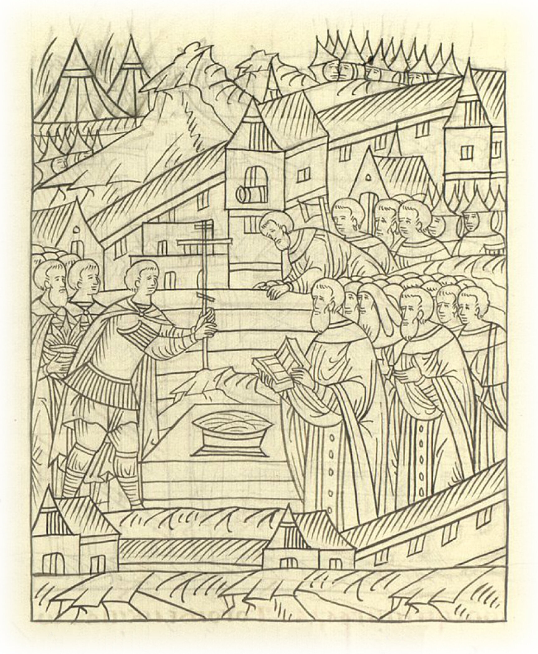 и избрал место в городе, и водрузил на нем крест своими руками царскими, и заложил на том месте церковь во имя пречистой Владычицы нашей Богородицы, честного ее Благовещения. И пел молебен протопоп Андрей с игуменами и священниками, и освятили воды.