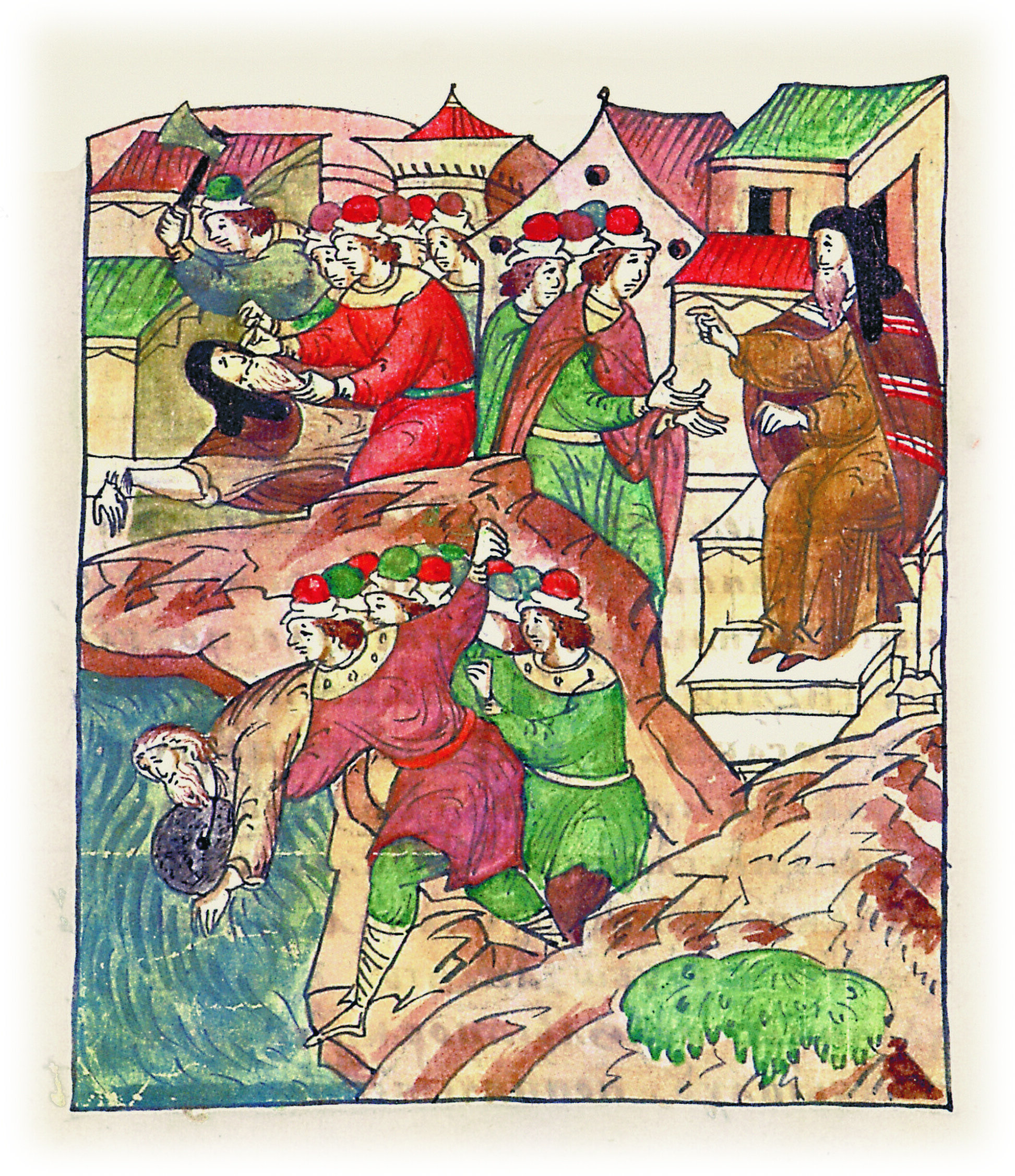 Митрополит же послал к нему, говоря так: «На Господа Бога и на Пречистую Богородицу, и на всех святых хулу изнес, тем же и Божий закон укорил, и множество людей замучил. И Божий закон говорит так: каким судом судите, тем же судят и вас, и в какую меру меряете, отмерится и вам, и суд без милости – не сотворившему милости». И так повелел ему язык урезать, как злодею и еретику, и руку правую отсечь, и очи вынуть; и так смерти предали его по евангельскому суду, который гласит: «Если кто соблазнит единого из немногих сих, верующих в Меня, лучшее для него, чтобы привязали камень жерновный на шее его, и пусть потоплен будет в море».