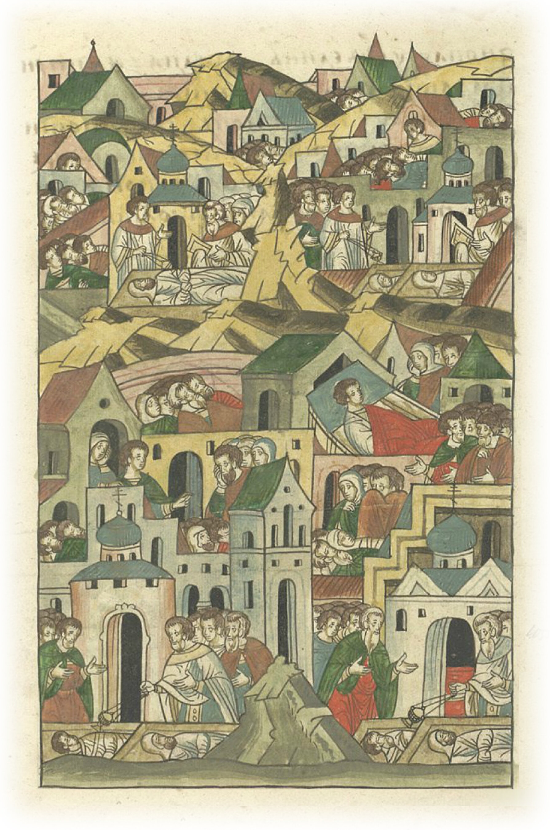 В 6872 (1364) году. Был великий мор в Нижнем Новгороде и во всех его землях, и на Саре, и на Кише, и по всем окрестностям. Люди кашляли кровью, а иные чумою болели один день или два, или три, и, прожив немного, умирали днем и ночью. Не успевали живые мертвых погребать, так как на дню умирало по пятьдесят и по сто человек и больше.
