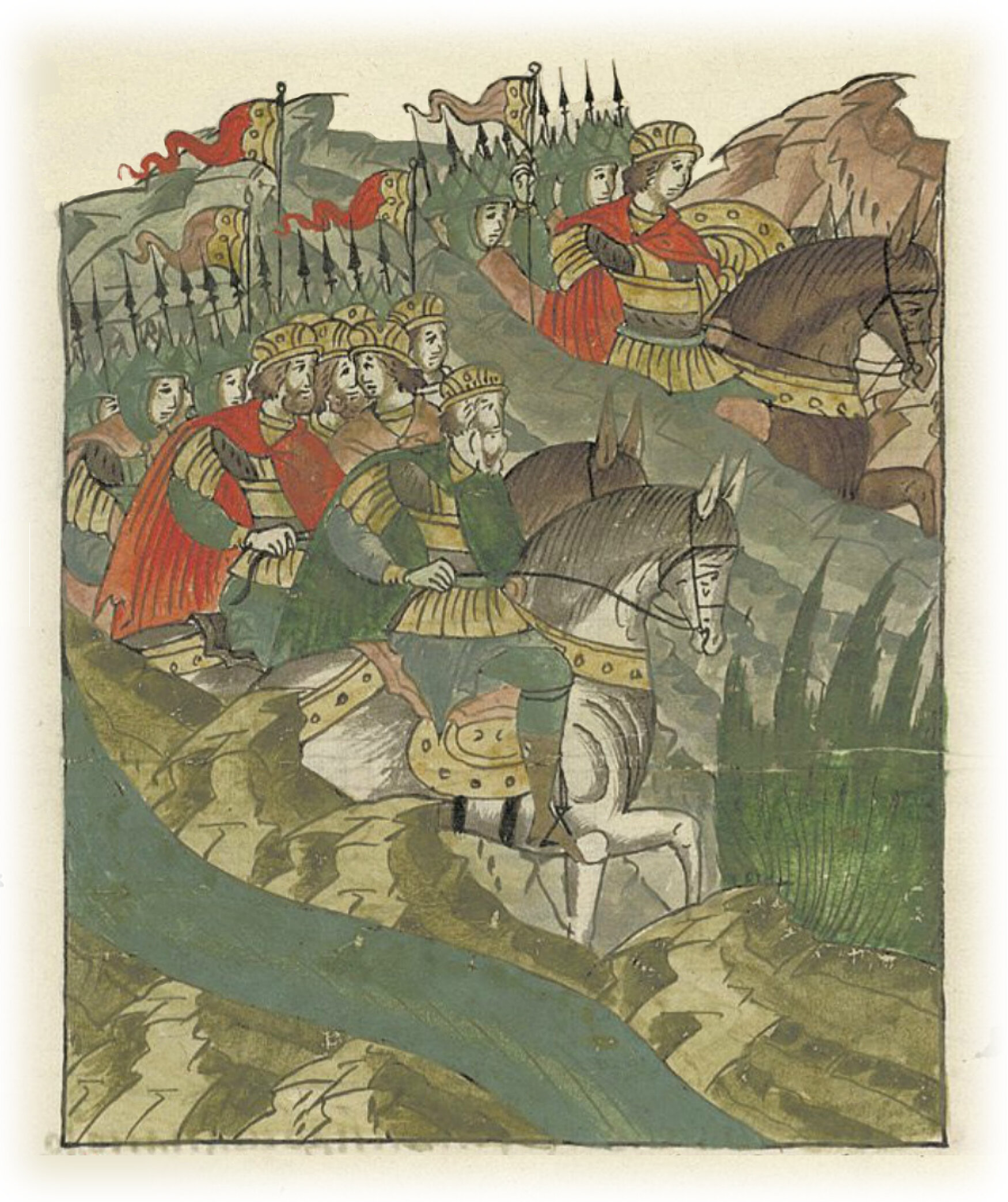 И, перейдя через реку Босг (Буг), искали их 5 дней. Владимир Глебович, внук Юрия Долгорукого, ехал впереди со сторожевыми полками, переяславцев и берендеев с ним было 2 200 воинов.