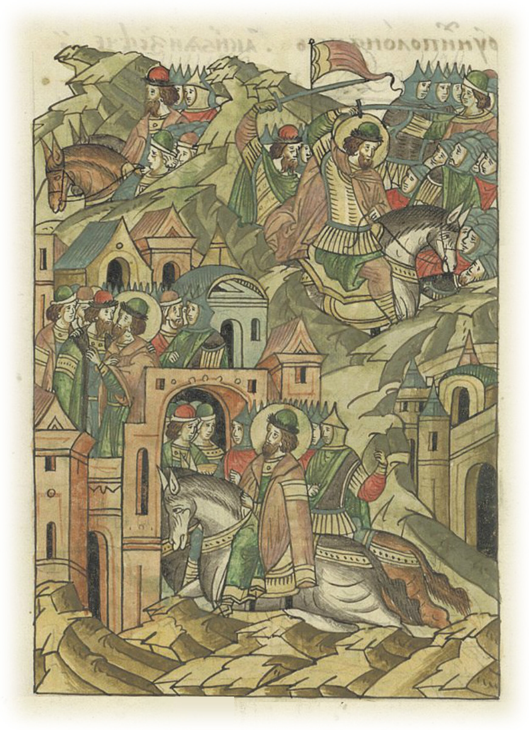 И той ночью пришел к ним на помощь князь Александр Ярославич с новгородцами, и была радость большая, обнимались и целовались; а на следующий день вышли, ополчившись, на литовцев, и была сеча злая, и победили литовцев, отняв у них весь полон, а князя посекли.