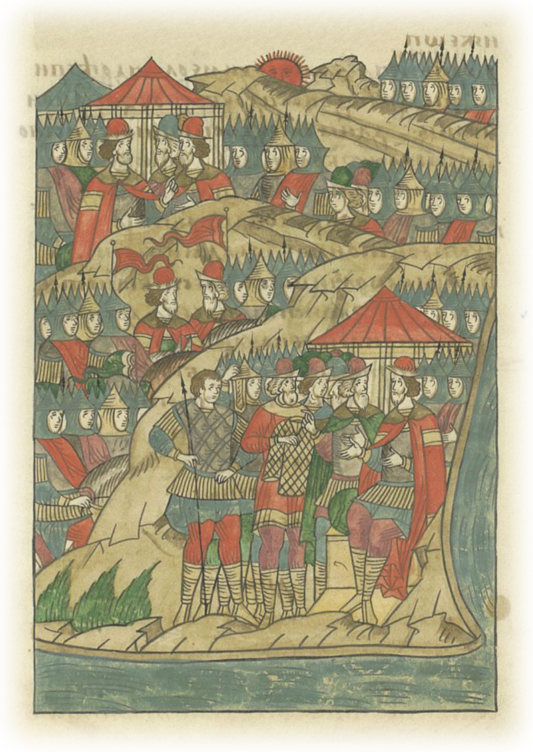 Великий князь Дмитрий Иванович отпускает князя Владимира Андреевича вверх по Дону в дубраву с засадным полком и с воеводой Дмитрием Боброком. Полки в доспехах стоят на Куликовом поле, на устье Непрядвы-реки.