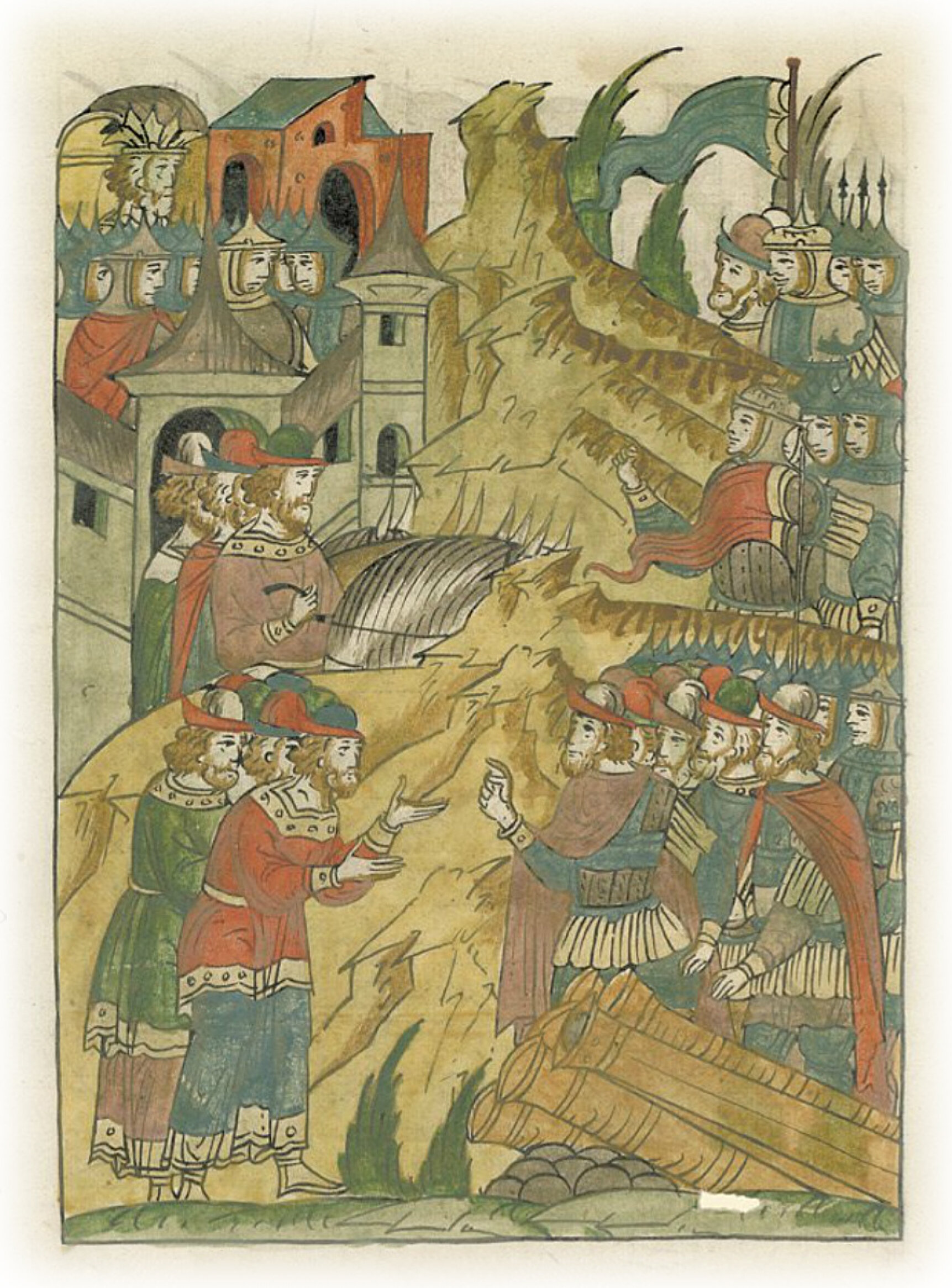 Казанские князья выезжают из города и бьют челом воеводам великого князя.