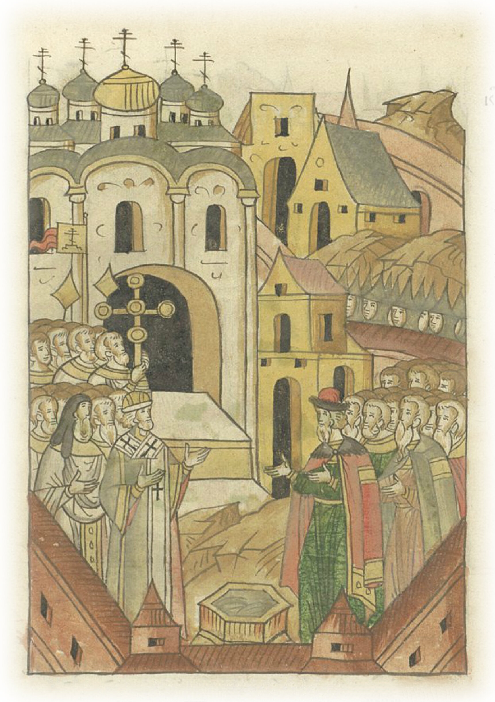 Святейший же Филипп, митрополит всея Руси, встретил его с крестами близ великой церкви, только сойдя с Большого каменного моста до площадного колодца, со всем освященным собором на площади города; и была радость великая всем людям державы его в городе Москве.