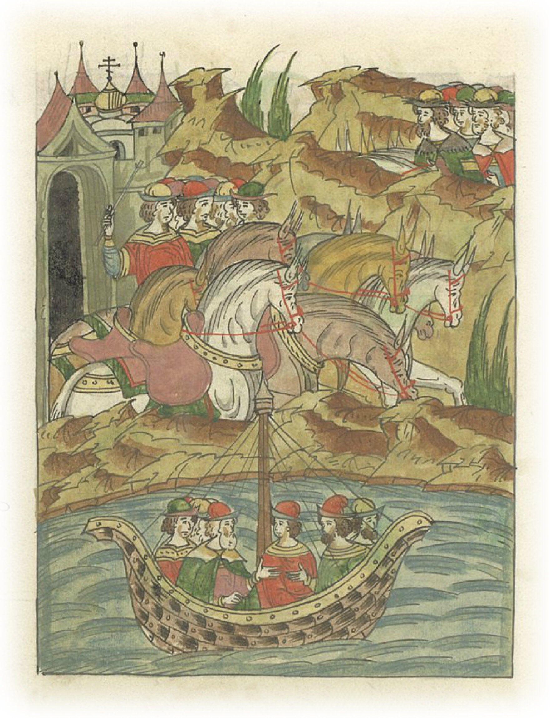 И дьяк Федор с Бигичем в ту же пору отправились из Мурома на судне, а коней повели берегом.