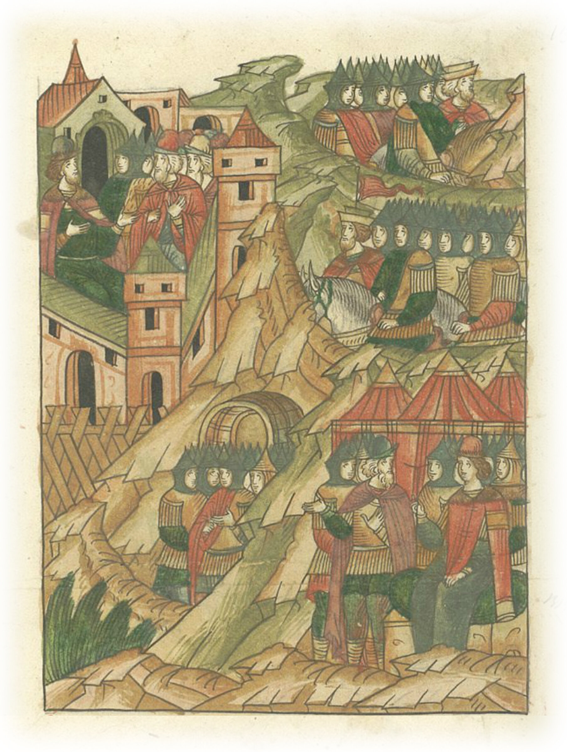 Языки говорят воеводам царя Ивана Васильевича, что магистр окопался большим рвом вокруг города Рындола, бьет из пушек и пищалей и приступает к Рындолу.