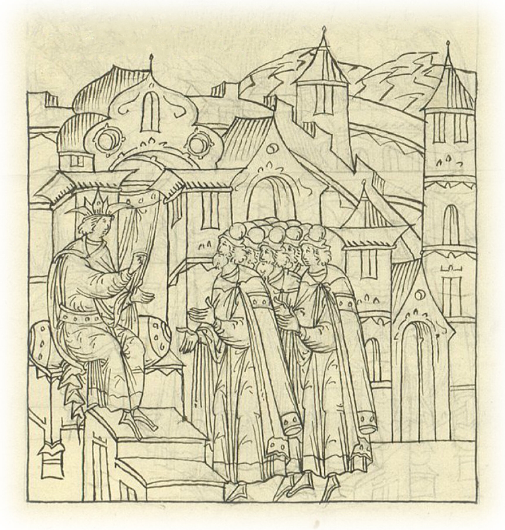 И начал государь со своими боярами размышлять, как поступить с Казанью: и начал призывать казанских князей, которые приехали из Казани служить к нему, Кострова-князя с товарищами; и начал думать о том, чтобы основать город на Свияжском устье на Круглой горе; так как сам государь, возвращаясь из Казани, видел, что это место удобно и подходит для постройки города.