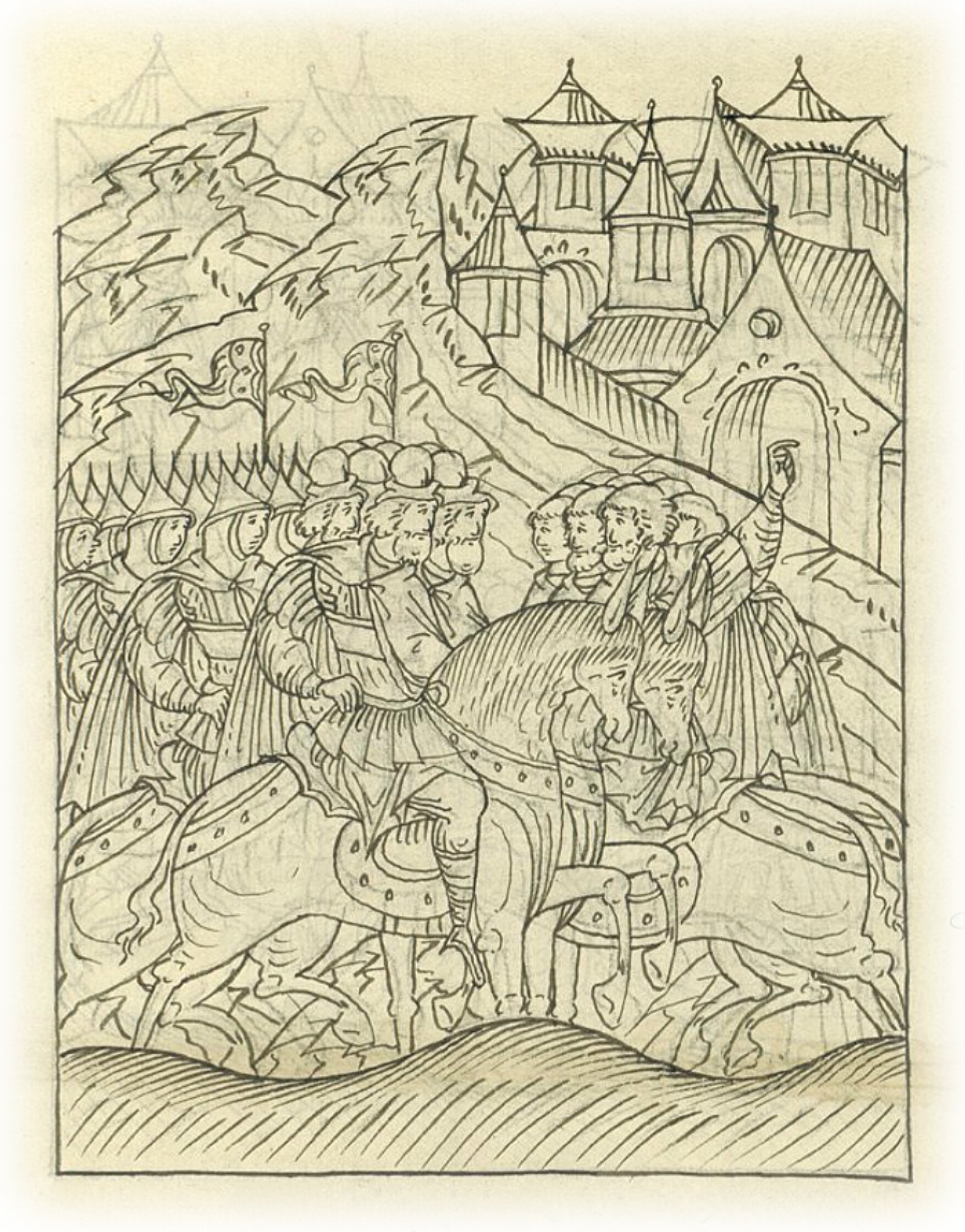 Языки говорят воеводам царя Ивана Васильевича, что магистр окопался большим рвом вокруг города Рындола, бьет из пушек и пищалей и приступает к Рындолу.