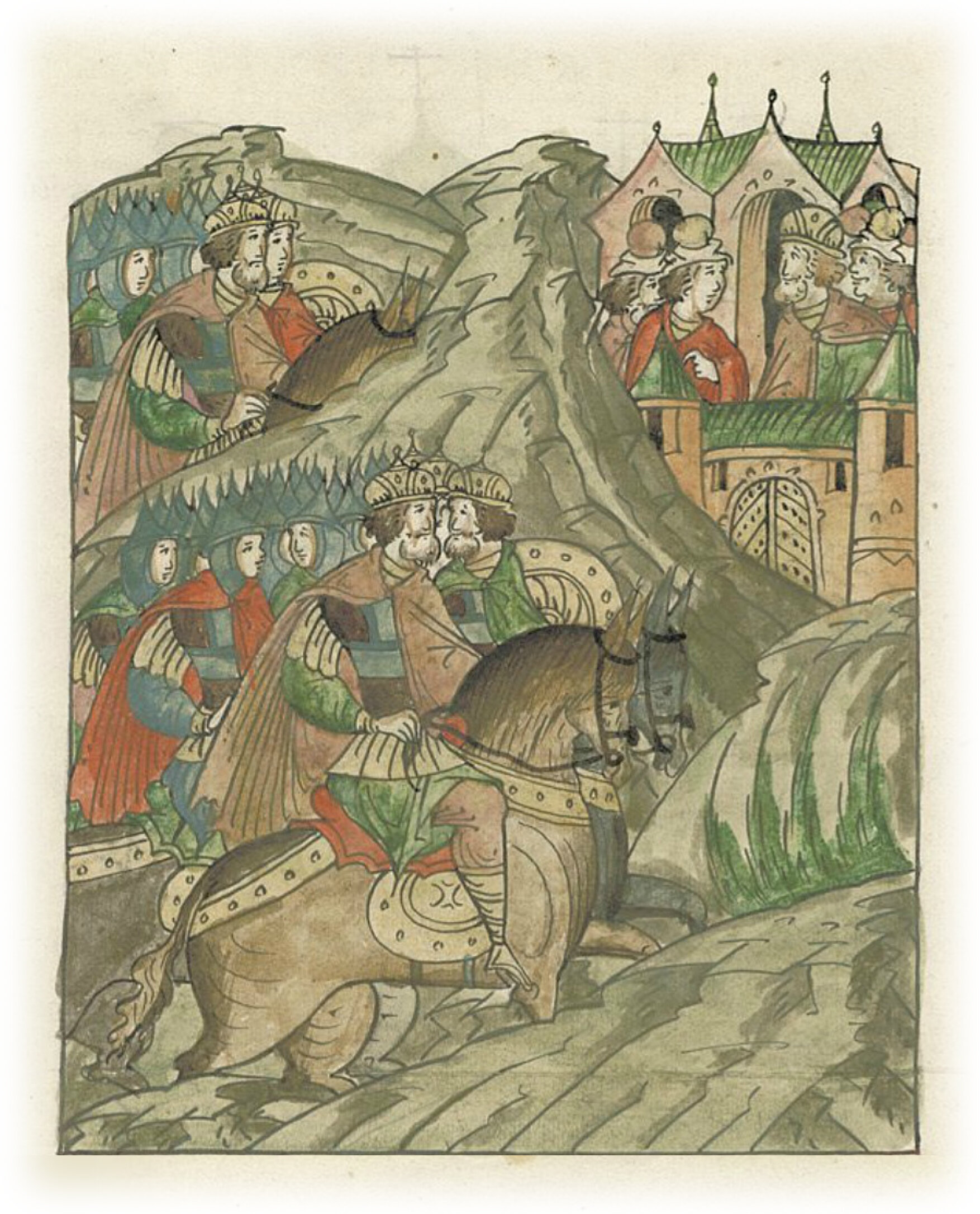 Князь Юрий Всеволодович с племянниками, с Васильком и Всеволодом Константиновичами, идет на помощь своему шурину, князю Михаилу Всеволодовичу Черниговскому, против Курского князя Олега.