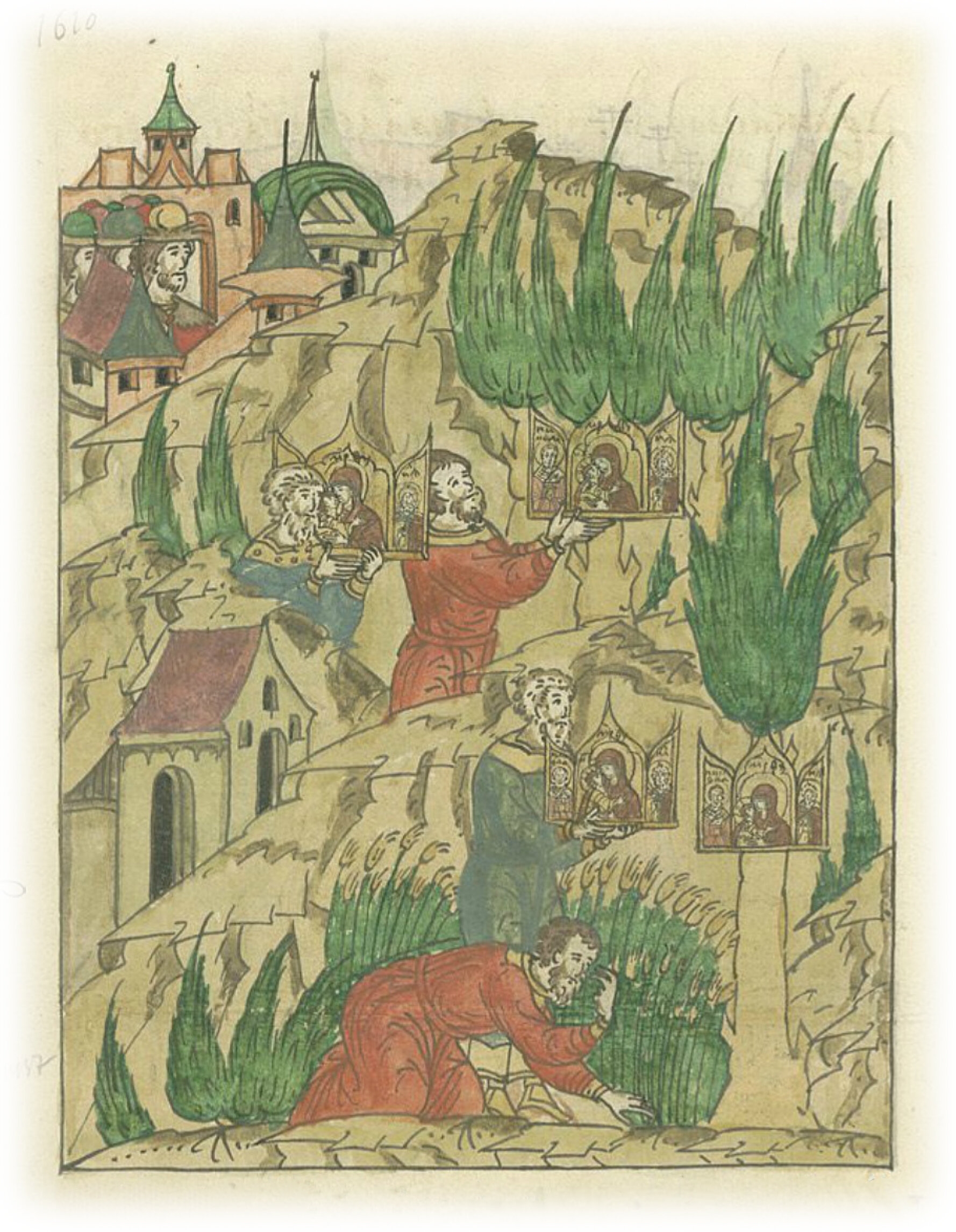 В том же году за 15 верст от Можайска в вотчине князя Андрея Дмитриевича, внука Иванова, правнука Иванова, праправнука Даниила Московского, явилось знамение: в Колоче один человек по имени Лука по происхождению из простых людей, бедный земледелец нашел на дереве в некоем месте икону Пречистой Богородицы держащую на руке младенца, Господа нашего Исуса Христа. С одной стороны иконы на створке был изображен Николай Чудотворец, а с другой – Илья Пророк. И, взяв эту икону, поцеловал ее с верой, поставил на дереве недалеко от своей нивы.