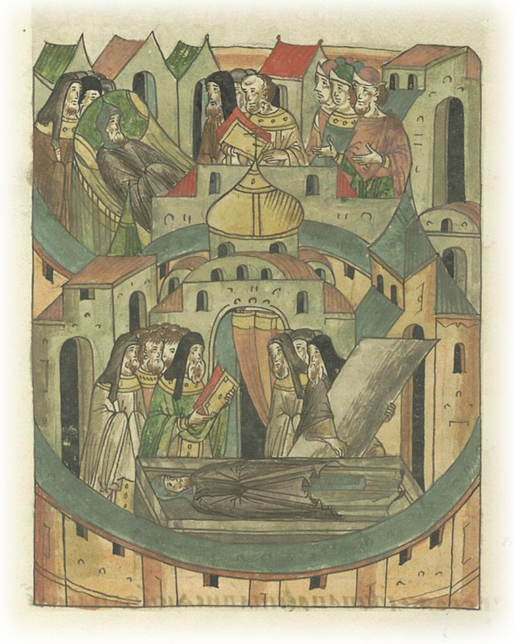 Кончина князя Василия Давыдовича Ярославского и его похороны в церкви святого Спаса в Ярославле.