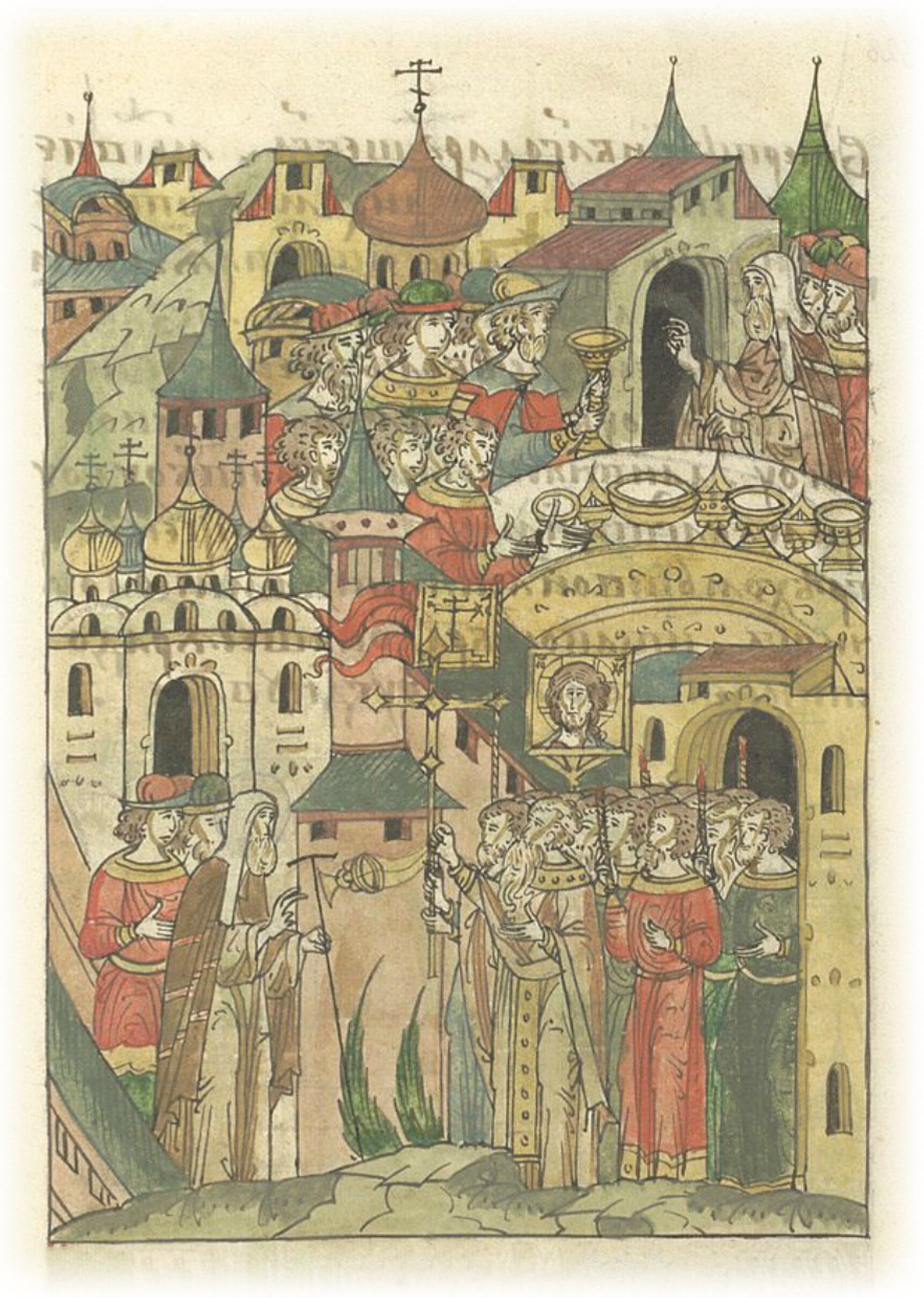 Новгородцы встречают пробывшего более трех лет в заточении в Москве владыку Иоанна.