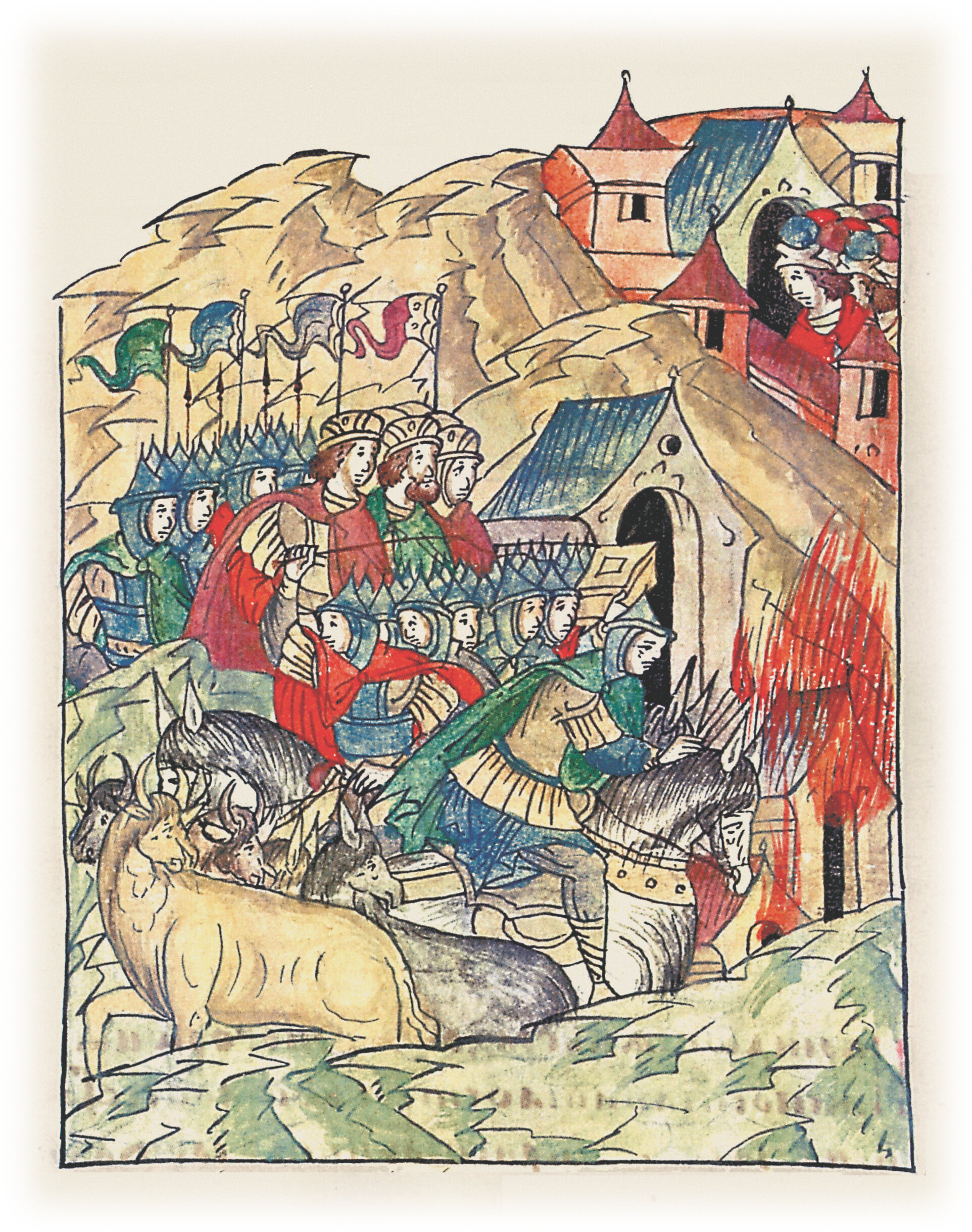 Пришли они в землю Новгородскую и много зла сотворили, села взяли и пожгли, и людей посекли, а жен и детей, и имущество, и скот взяли.