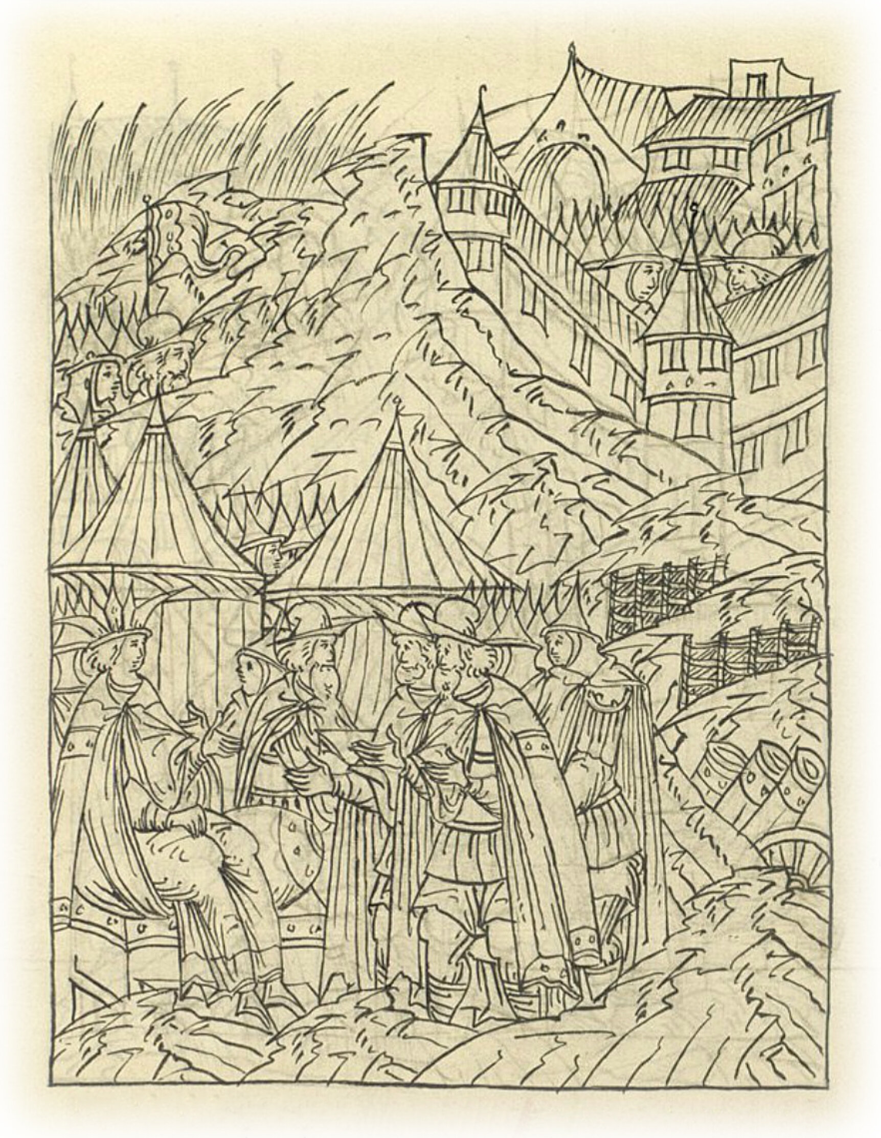 Языки говорят воеводам царя Ивана Васильевича, что магистр окопался большим рвом вокруг города Рындола, бьет из пушек и пищалей и приступает к Рындолу.