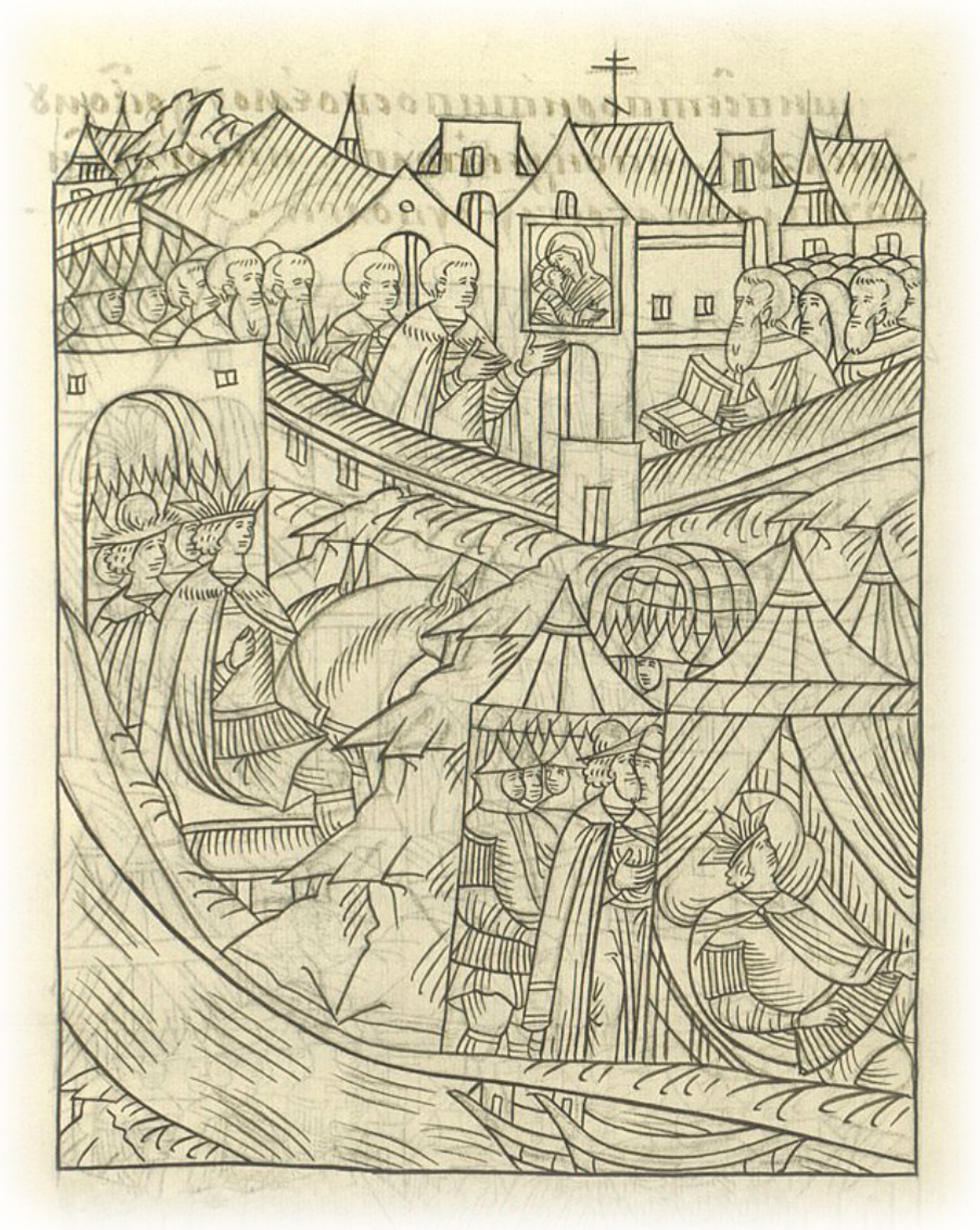 О походе из Казани. И в тот же день царь и государь слушал молебен у Благовещения пречистой Богоматери и, положив всю надежду на милосердного Бога и пресвятую его Богоматерь и великих чудотворцев, изрек: «Ты, Владыко наш Христос, это сделал, Ты и сохрани во имя свое город и людей!» И приказал боярину своему и воеводе князю Александру Борисовичу с товарищами все делать по своему царскому наказу, и пошел к Волге; и в тот день ночевал на берегу у Волги.