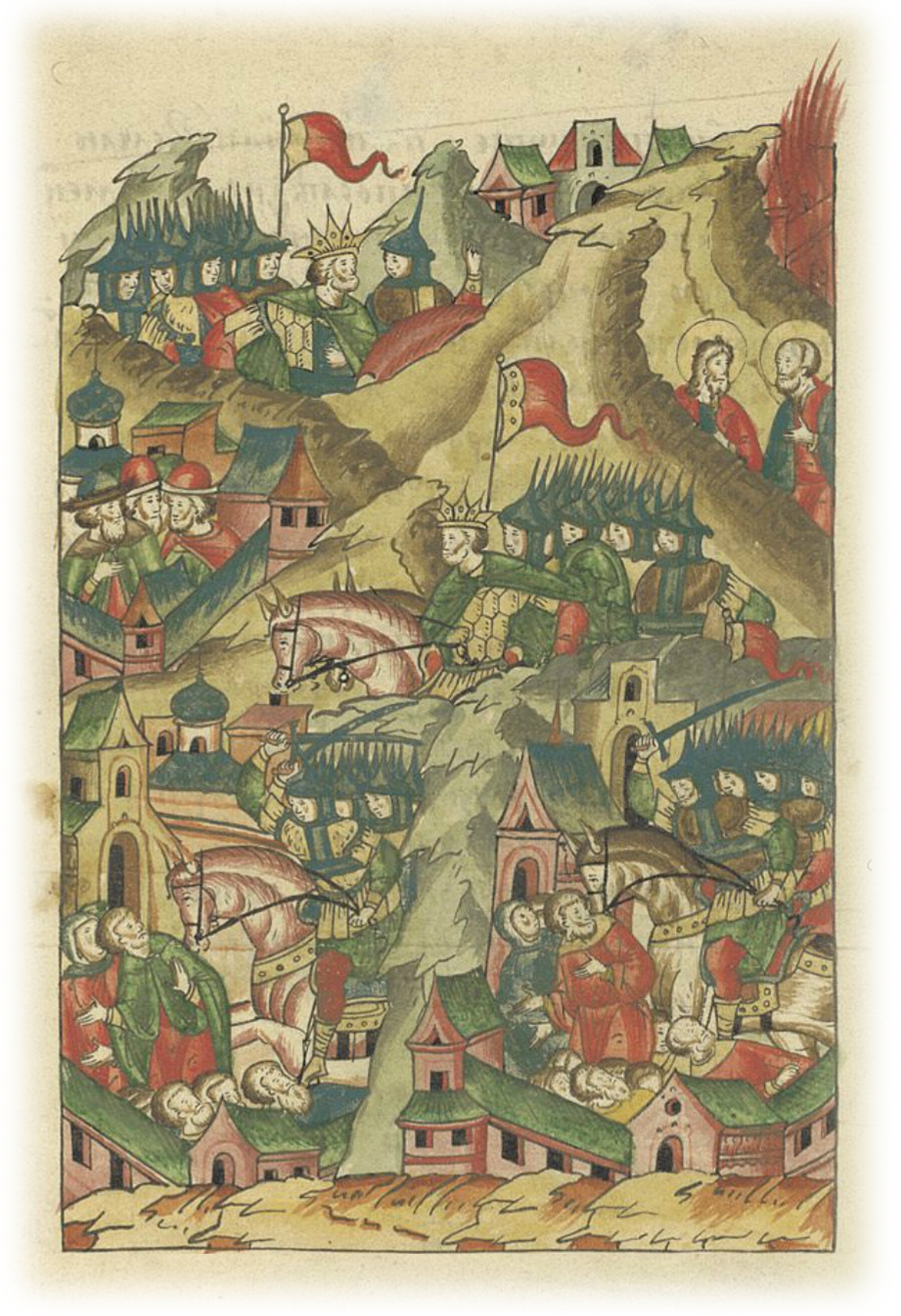 В то же лето убит был князь Михаил Всеволодович Черниговский, внук Святослава Олеговича, окаянным царем Батыем в Орде, и с ним боярин его Феодор. Бог попустил за умножение грехов наших и, как при Ное и как при Лоте казнь Божья на землю пришла, также и на Русскую землю, которую в последние времена навел Бог рукою своей на землю христианскую, по пророчеству древних пророков, говоривших: «Если захотите и послушаете меня, благо земное обретете; если не захотите, не послушаете меня, войну вы получите». Минуло время, и излился гнев Божий на всех, живущих на земле, ибо говорится: если хотите, живите в правде, если не хотите, не послушаете, то один победит 1000, а два одолеют тьму. Гневом Божиим были посланы на землю язычники, сокрушившие города; когда злочестивый царь Батый многие города разрушил, и многое кровопролитие сотворил, и отошел в Поле, в землю Половецкую.