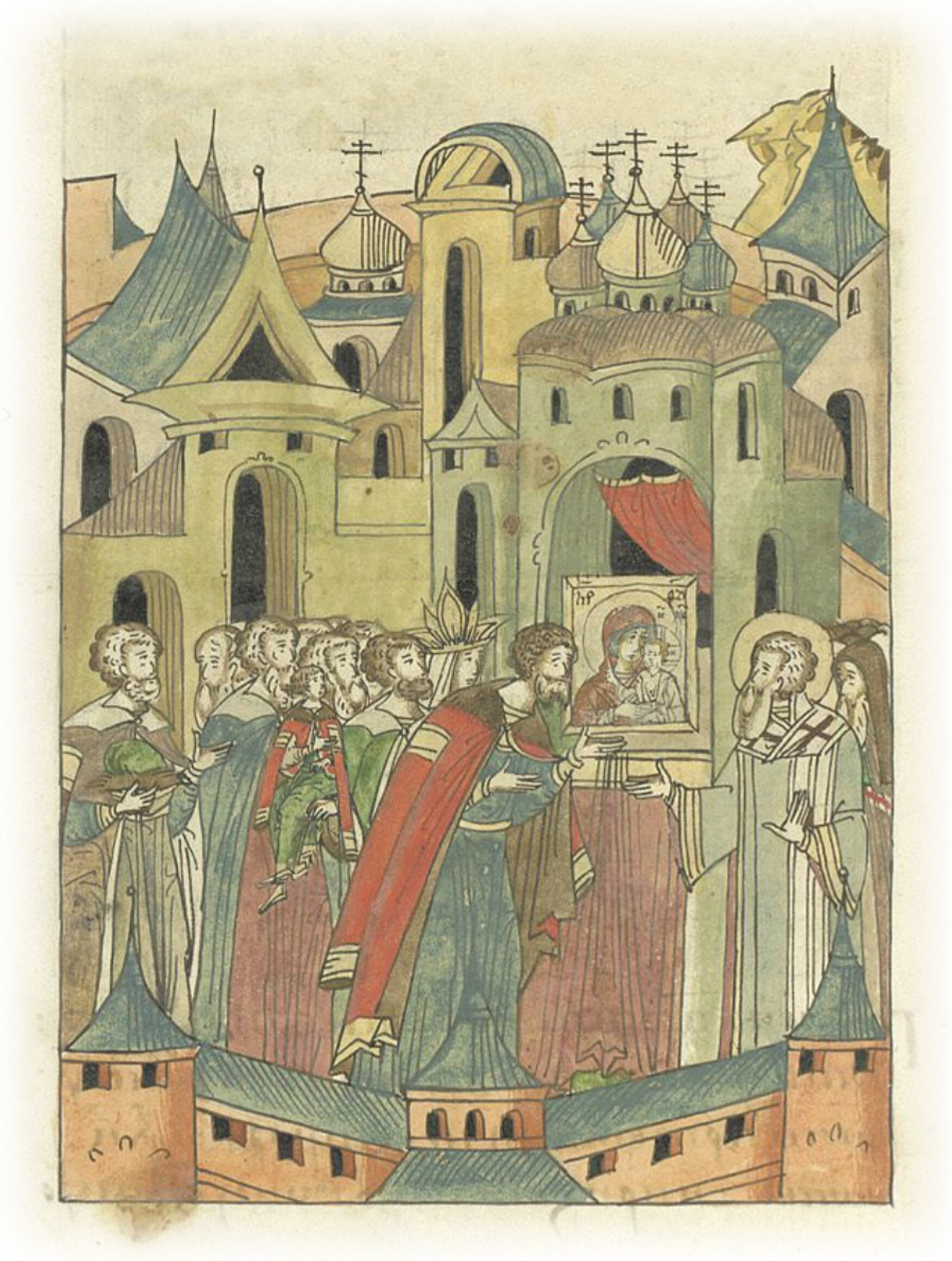 По совершении же литургии приходит великий князь к образу Пречистой, а также и митрополит, и великая княгиня Мария, и сыновья их великий князь Иван и князья Юрий, Андрей, Борис; и Андрей меньшой, еще ребенок, принесен на руках. И все перекрестились.