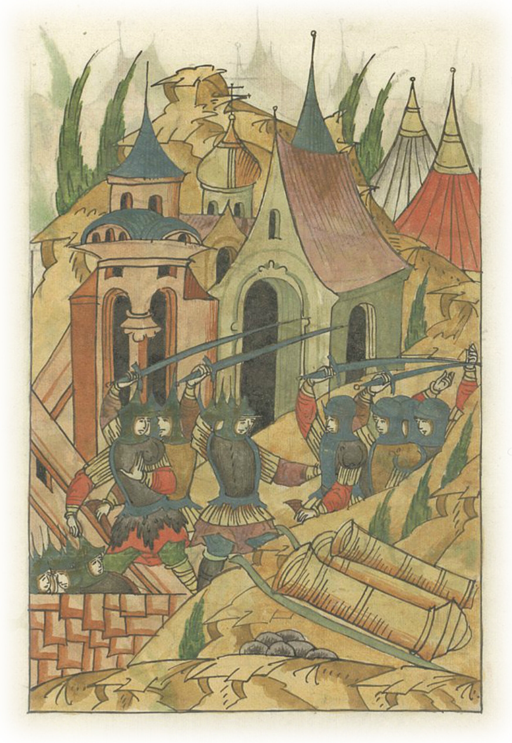 Языки говорят воеводам царя Ивана Васильевича, что магистр окопался большим рвом вокруг города Рындола, бьет из пушек и пищалей и приступает к Рындолу.