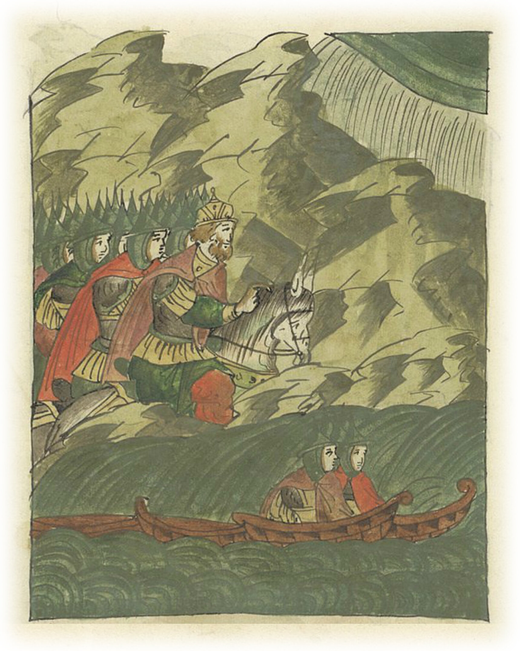 И пошел оттуда Святослав к ладьям своим. Когда же пришел он к ладьям, поднялась такая буря с дождем, что все ладьи разметало. Потом буря начала стихать.