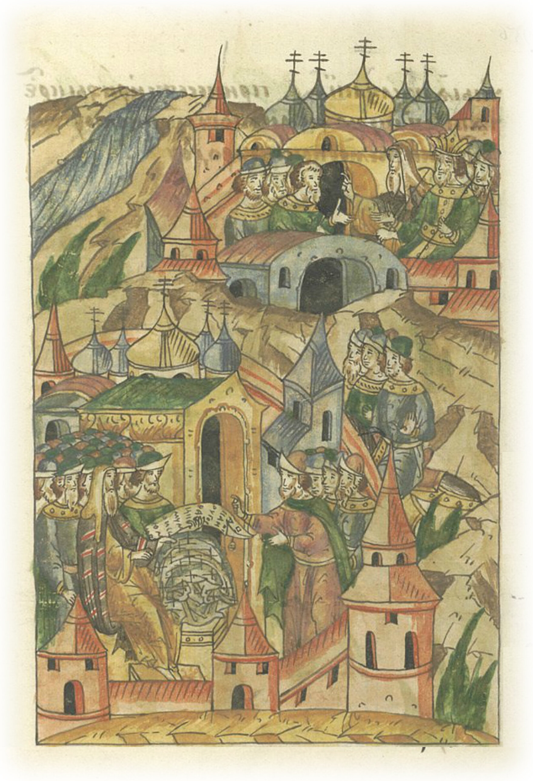 Посол Новгородского владыки приносит из Царьграда грамоты о поборах за поставления, о церковных пошлинах и различные указания от патриарха Филофея и греческого царя Ивана Контакузина, а также крестчатые ризы в дар Новгородскому владыке Моисею.