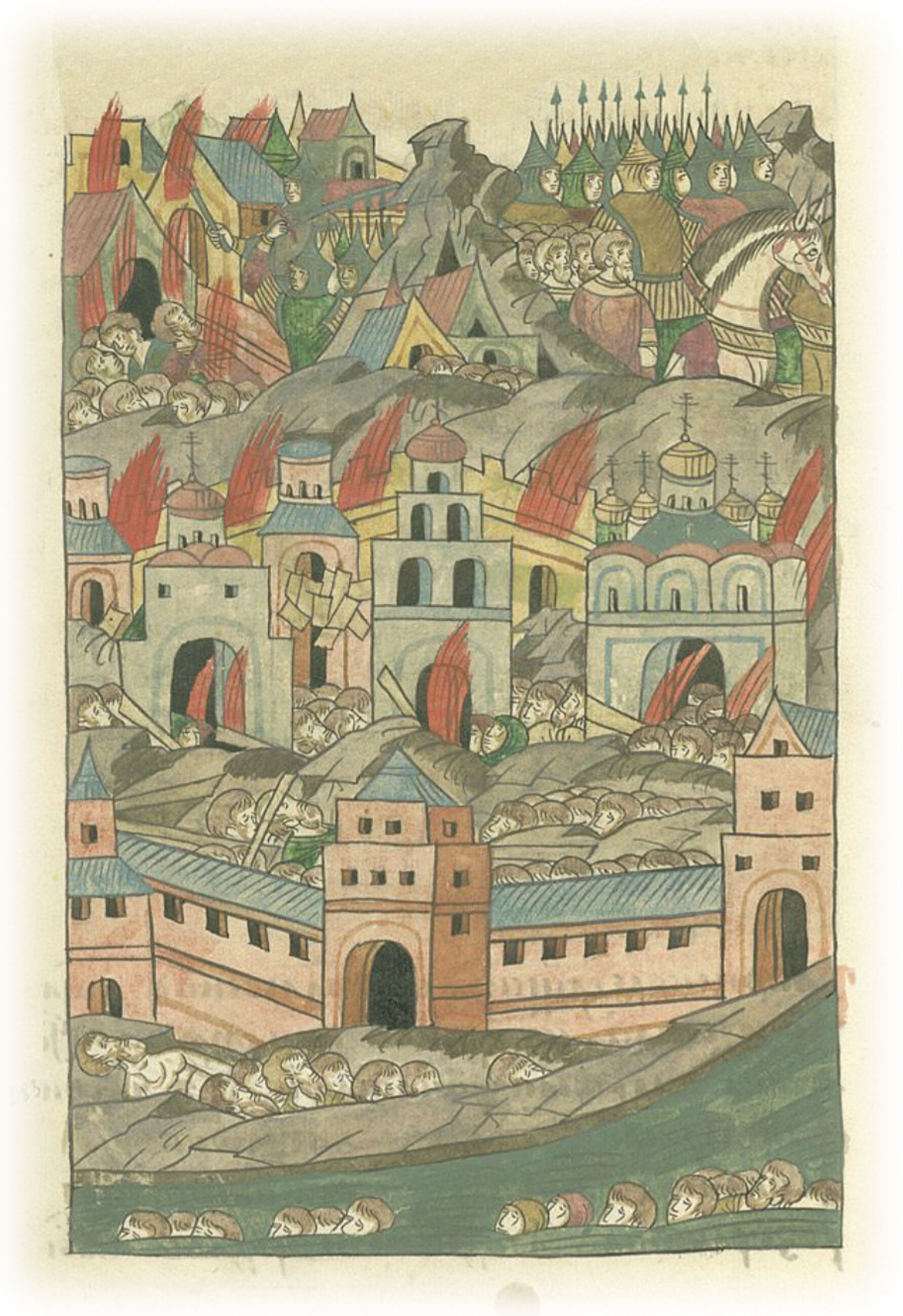 Было ведь до того, выглядел город Москва великим и чудным, и много людей в нем (было), кипел богатством и славою, превосходил же все города в Русской земле честью многою: ибо в нем князья и святители жили. В это же время изменилась красота его, и отошла слава его, и всякая честь за один час изменилась, когда взят был и сожжен. Не видно (было) иного ничего, кроме дыма и земли, и трупов мертвых многих лежащих. Церкви святые запалены были и пали, а каменные стояли, выгорев внутри и обгорев снаружи, и не (было) слышно в них пения, ни звона в колокола, никто из людей не ходил в церкви, и не было слышно в церкви поющего гласа, ни славословия, но все выглядело пустым, ни одного не было видно ходящего по пожару человека. И не один же город сей, Москва, (был) взят, но и прочие города и местности попленены были нечестивыми.