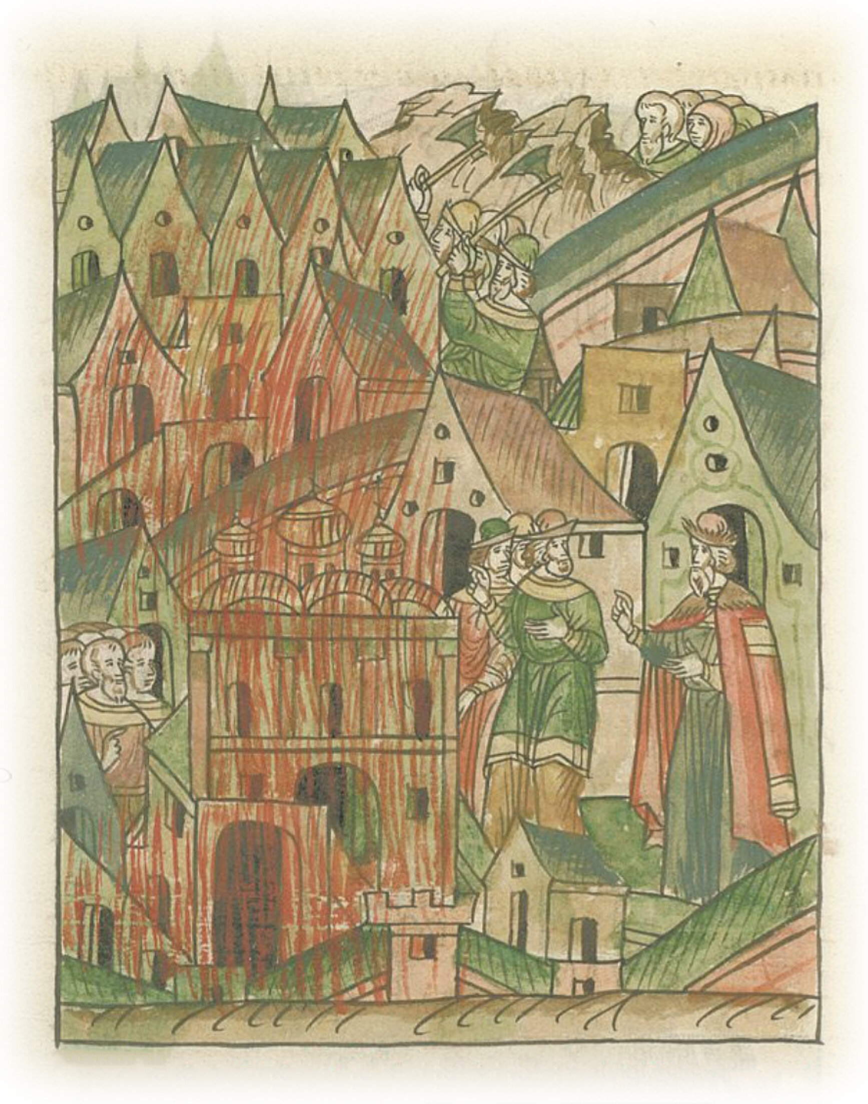 О кончине Филиппа митрополита и о пожаре. Той же весной, (месяца) апреля в 4 день, в неделю пятую Поста, которая называется Похвальная, в 4 часа ночи, загорелось внутри города на Москве близ церкви Рождества пресвятой Богородицы, у которой придел Воскресения Лазарева; и погорело много дворов, и митрополичий двор сгорел, и князя Бориса Васильевича двор по Богоявление Троицкое да по городские житницы; и дворец житничный великого князя сгорел, а большой двор его едва силой отстояли, так как князь великий был тогда в городе сам; да по каменный погреб горело, что на дворе князя Михаила Андреевича в стене в городской. И у церкви Рождества Пречистой кровля обгорела, также и кровля городской стены, и пристройки все городские; и сколько было дворов близ того, по житничный двор городской выгорело. Заканчивался уже последний час ночи,