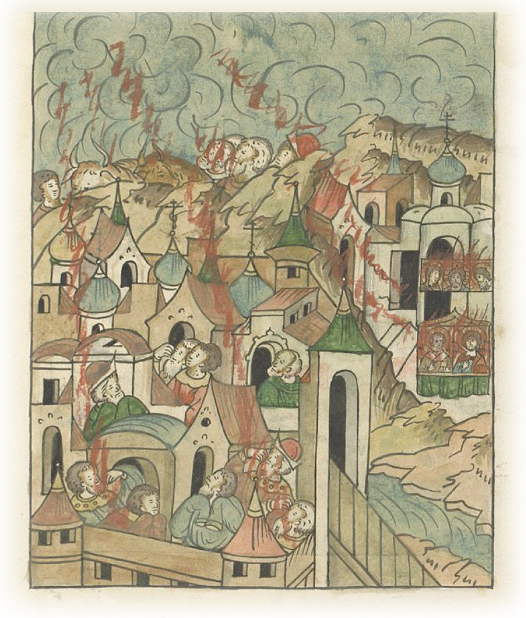 О туче и молнии, и громе, и о засухе, и о мгле. В том же году в июле в 23 день, в 11 часов дня, взошла туча великая страшная с востока зимнего, сияли молнии великие беспрестанно, гром, и вихрь. И убило молнией в городе Москве 9 человек; а за Яузою у церкви святого мученика Никиты пробило стену и у Деисуса попалило золото, а образа не повредило; а у икон киоты расщепило. И по иным местам побило много людей и скота.