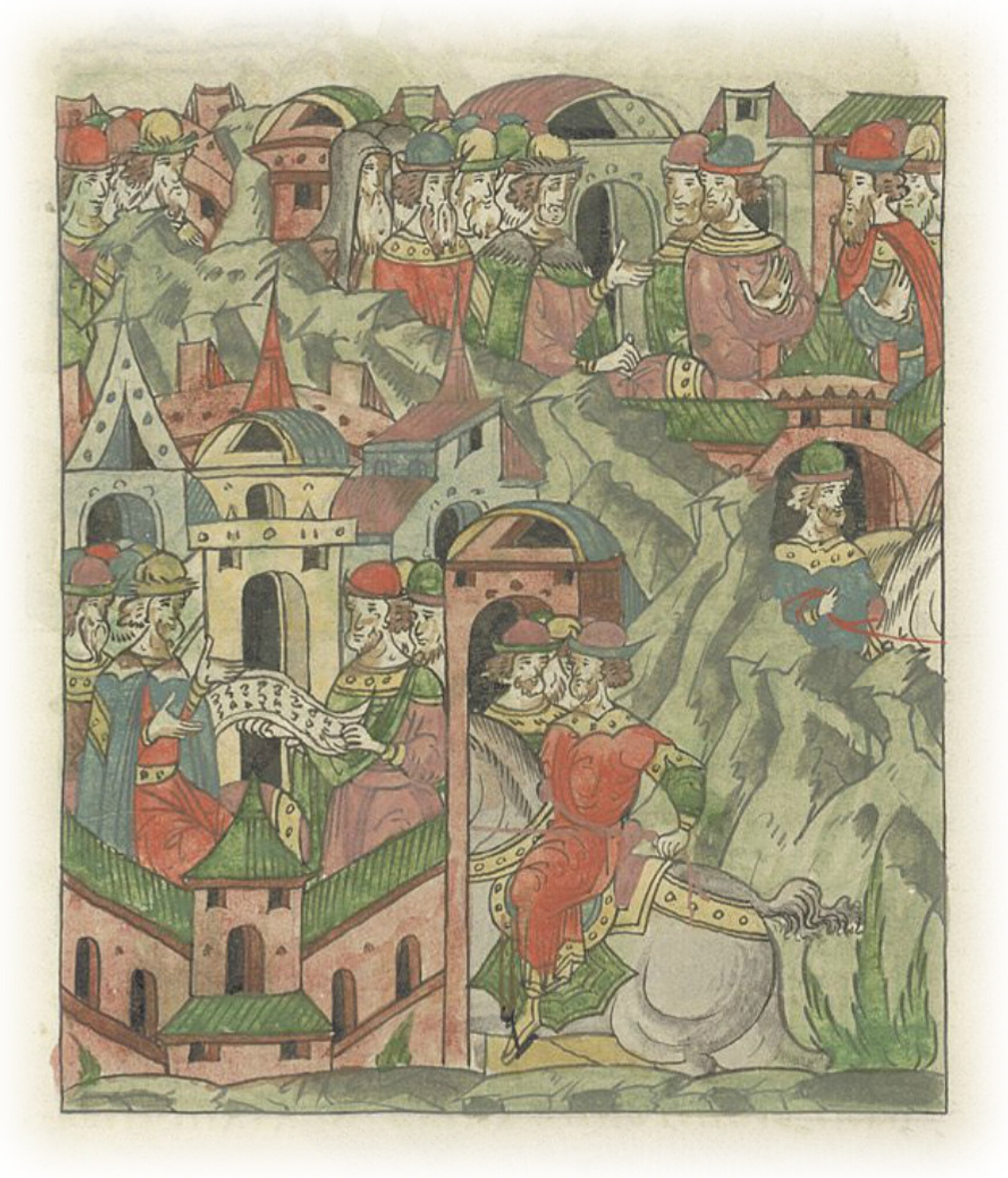 И посылают с прежде описанными речами к великому князю Борису Тверскому. Он же, узнав об этом, убоялся и стал единомышленником с ними. Многие же и из москвичей были согласны с ними: и бояре, и гости; были же и чернецы, думающие так же как они. И начали князья со своими советниками тайно вооружаться и искать подходящее время, чтобы изгнать великого князя.