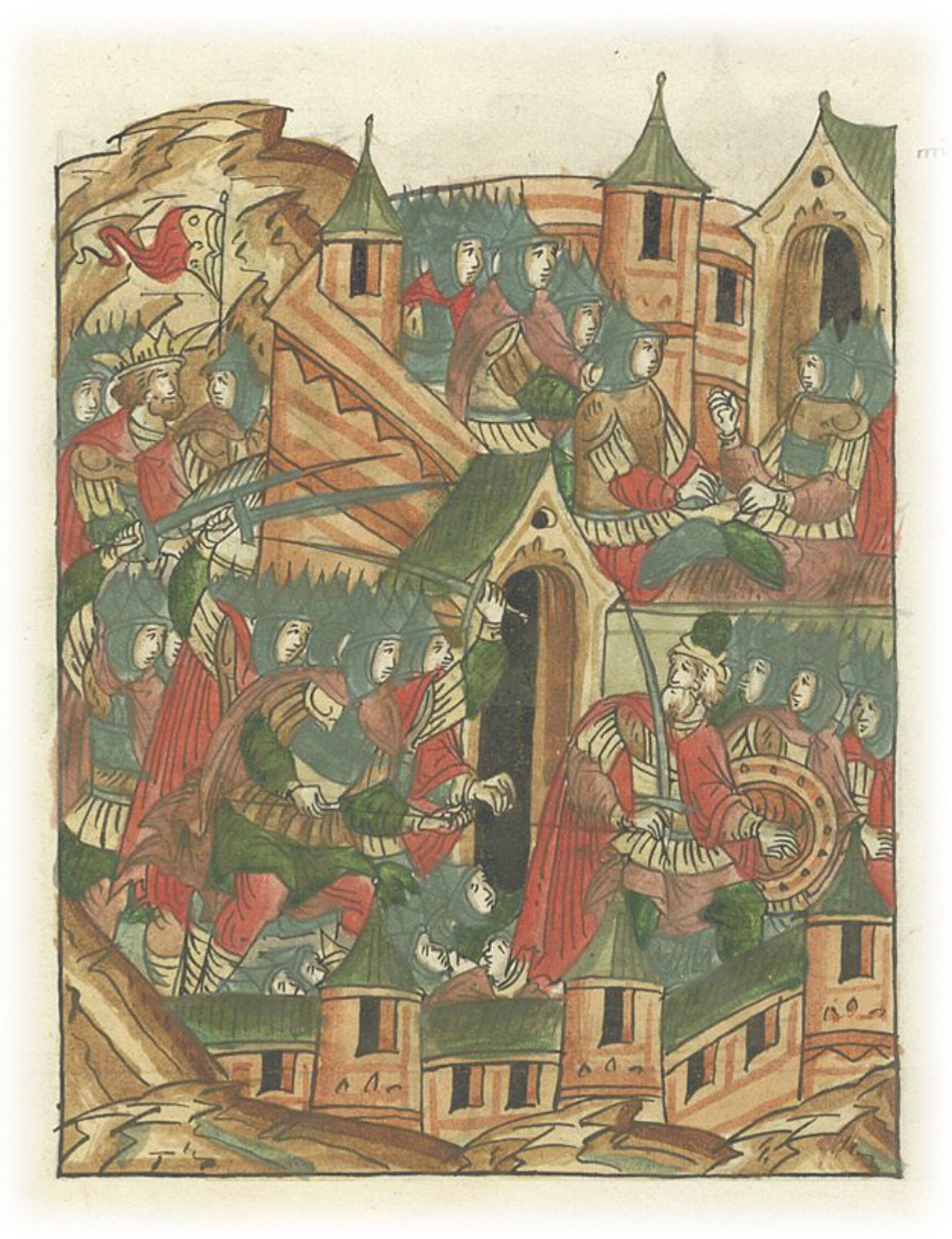 И сильно был ранен воевода Дмитр, и много отважных воинов было убито. И побеждены были горожане, и поднялись татары на стены, и от большой усталости расположились на городских стенах.
