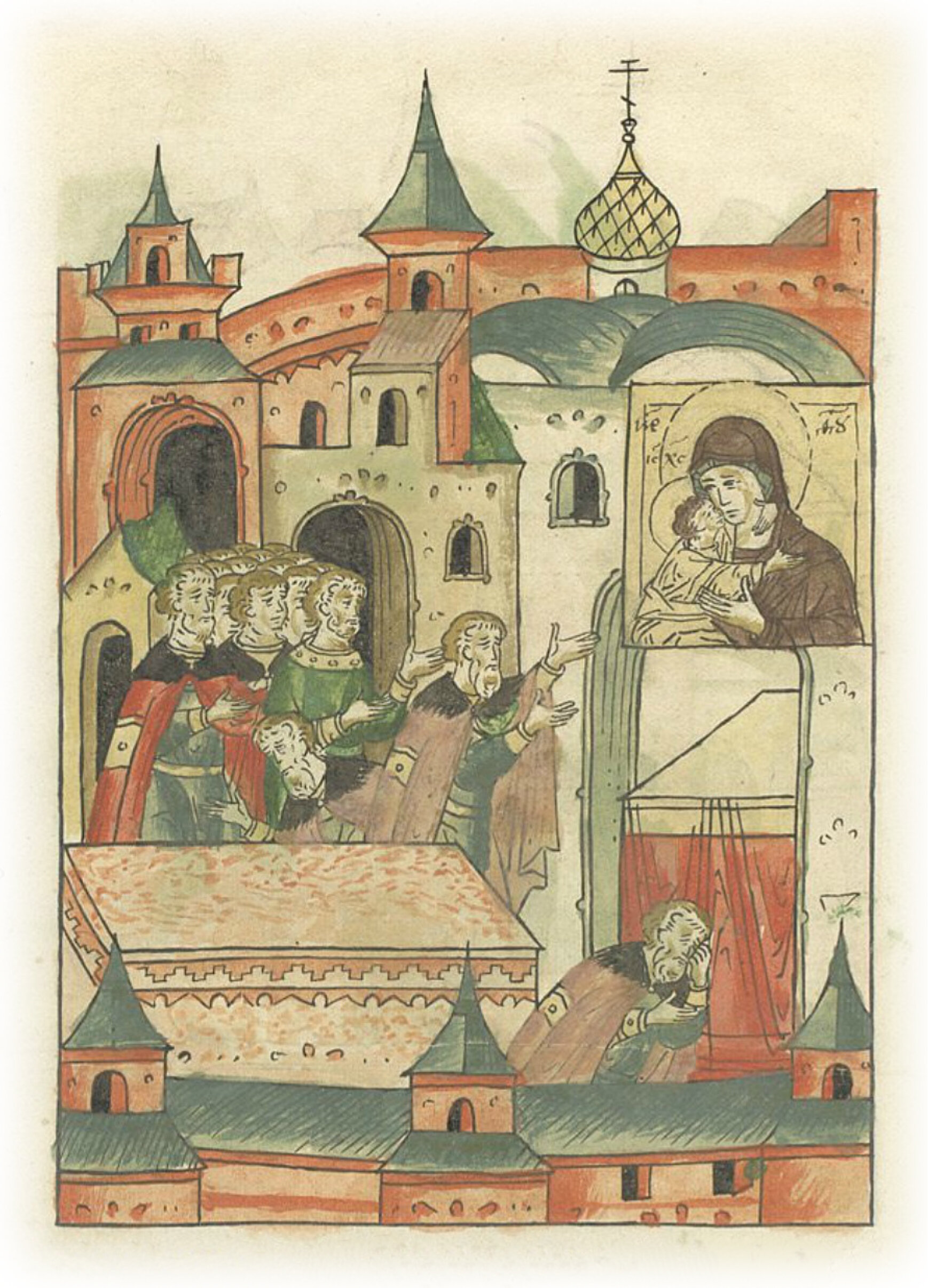И, войдя в город, пришел в церковь пресвятой Богородицы, и пал перед образом Господа, изливая многие слезы и говоря: «Благодарю Тебя, Владыка, что не предал стадо Твое православных христиан безбожным сыроедцам!» Также и перед образом Пресвятой пал, плача, и также молился, потом же и у гроба чудотворца Петра