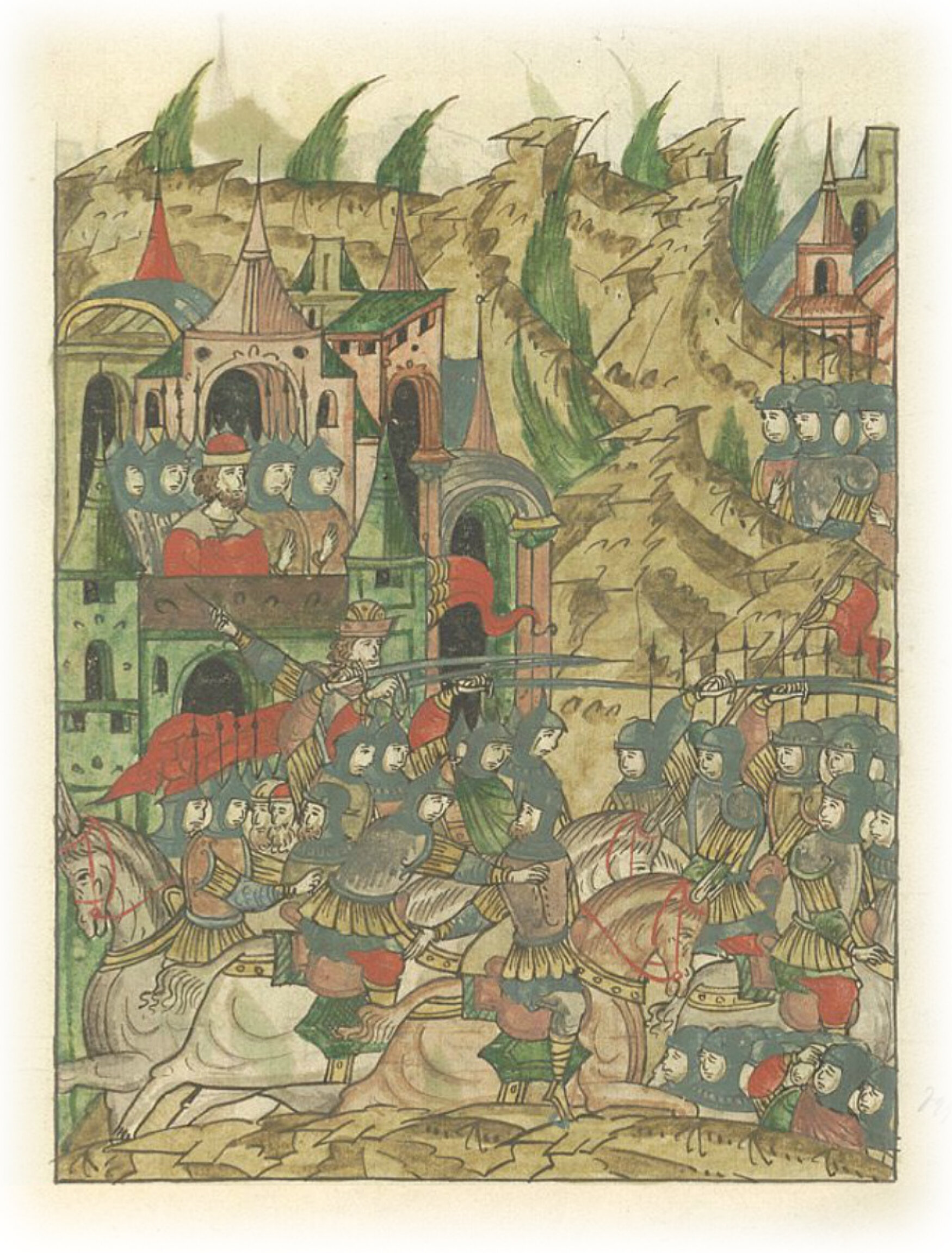 Языки говорят воеводам царя Ивана Васильевича, что магистр окопался большим рвом вокруг города Рындола, бьет из пушек и пищалей и приступает к Рындолу.