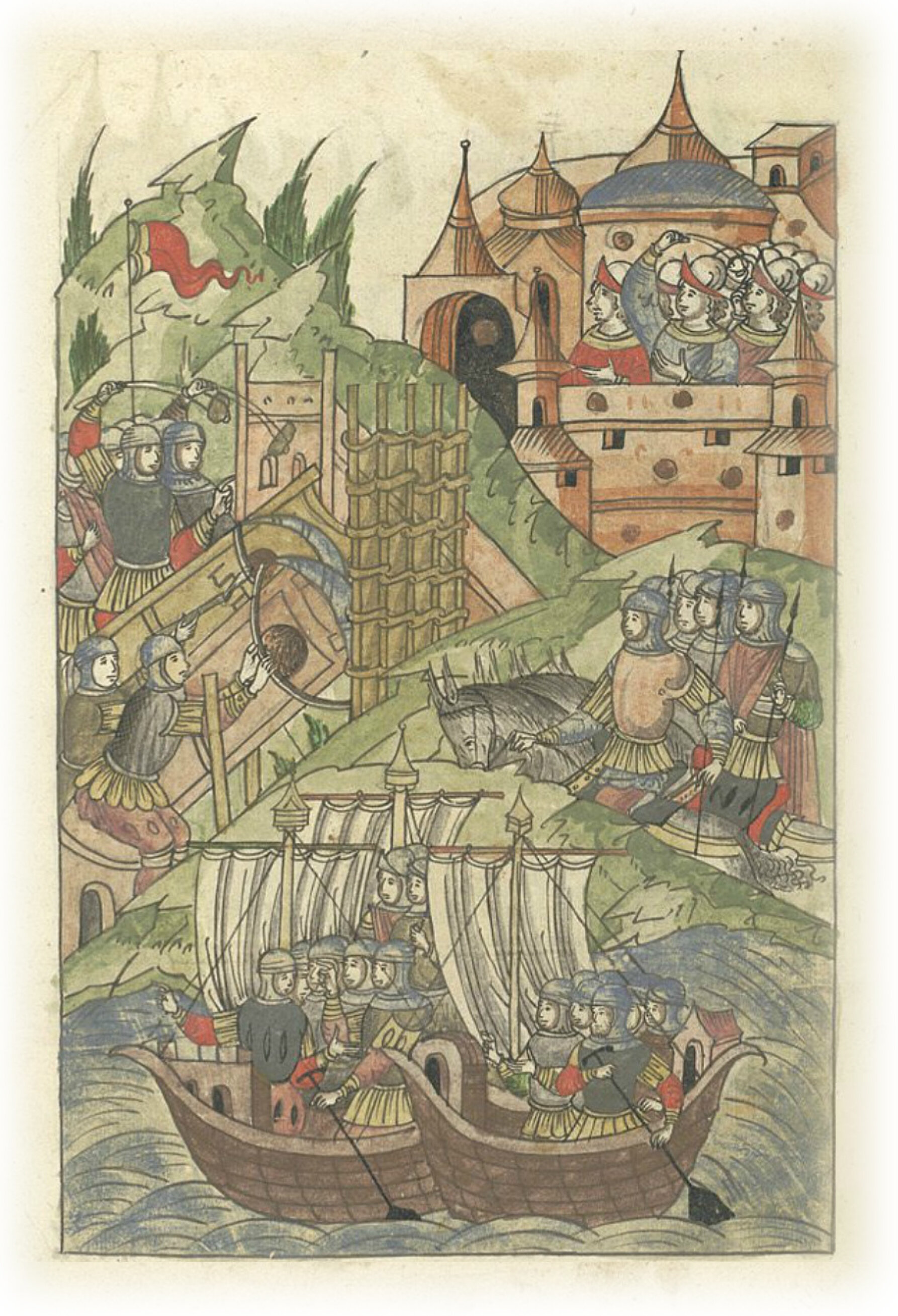 В том же году немцы приходили ратью ко Пскову в кораблях, в ладьях и на конях, и стояли 18 дней, обстреливая стенобитными орудиями и укрепления свои придвигая. И так стены городские били, и настала скорбь во Пскове великая.