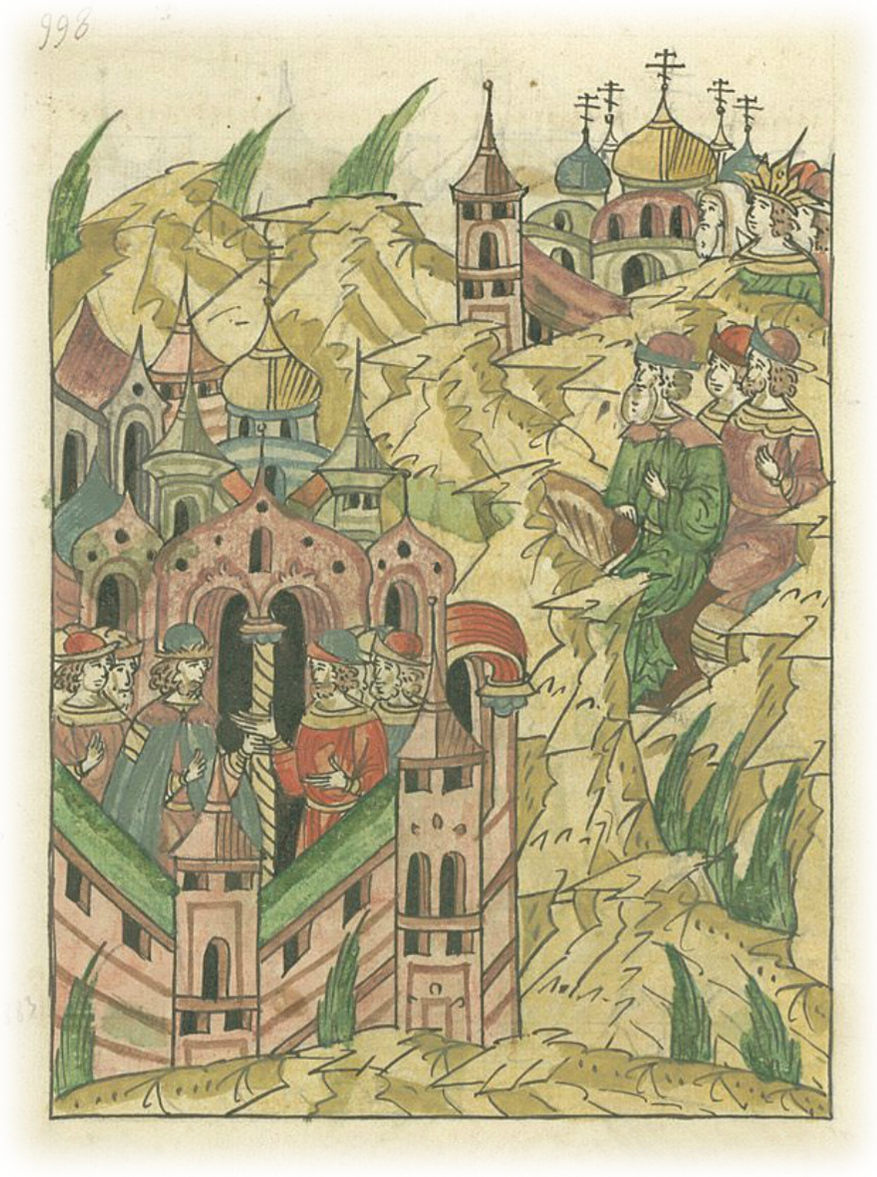 И вернулись к нему из Константинополя тверичи: Данила, протопоп соборной церкви святого Михаила, и Колоян, которые два года назад были посланы князем Михайлом Тверским в Царьград к патриарху и к царю с милостыней для соборной церкви святой Софии. Такой обычай был у него – часто посылать милостыню в соборную церковь святой Софии и патриарху. Царь и патриарх приняли их с почетом и отпустили. (После этого) патриарх прислал к нему посла своего архимандрита Германа с благословением и икону Страшный суд с мощами святых, и дорогое миро честное. И, когда они приблизились к городу,