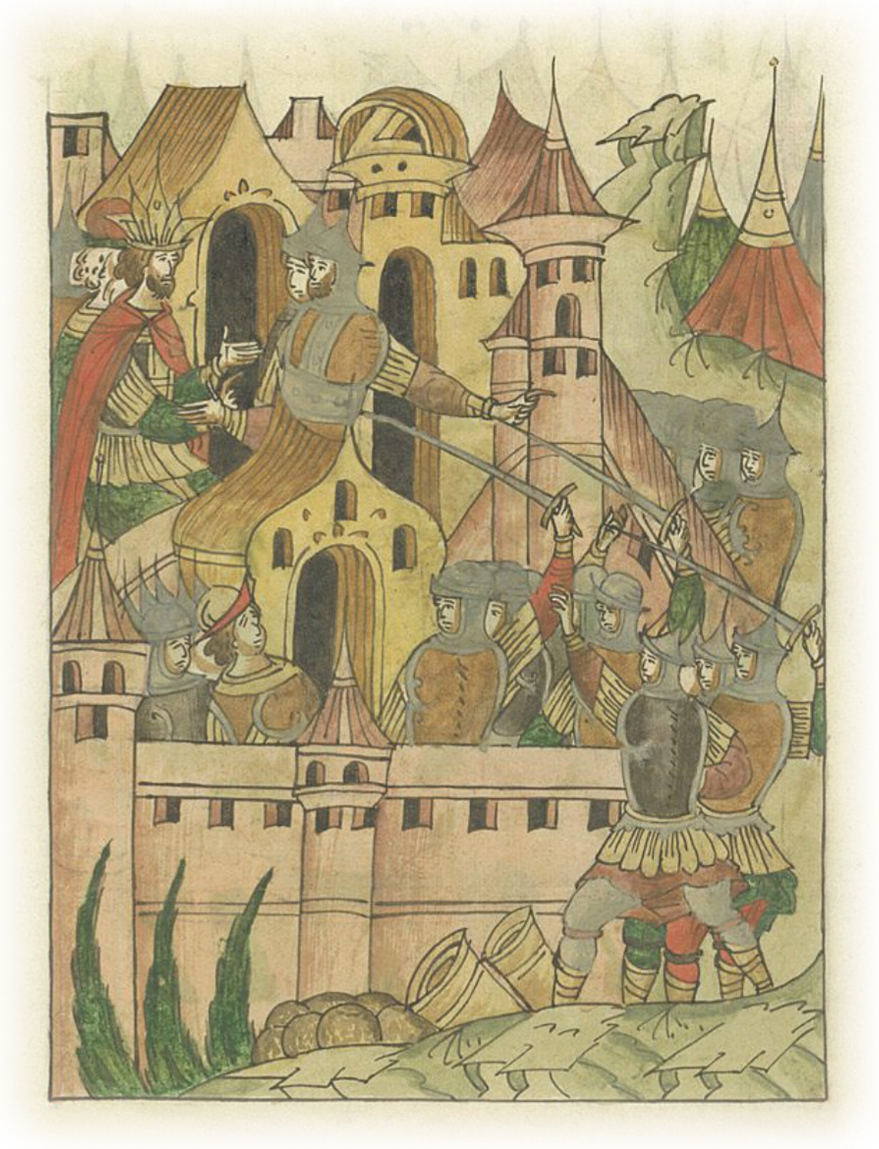 Языки говорят воеводам царя Ивана Васильевича, что магистр окопался большим рвом вокруг города Рындола, бьет из пушек и пищалей и приступает к Рындолу.