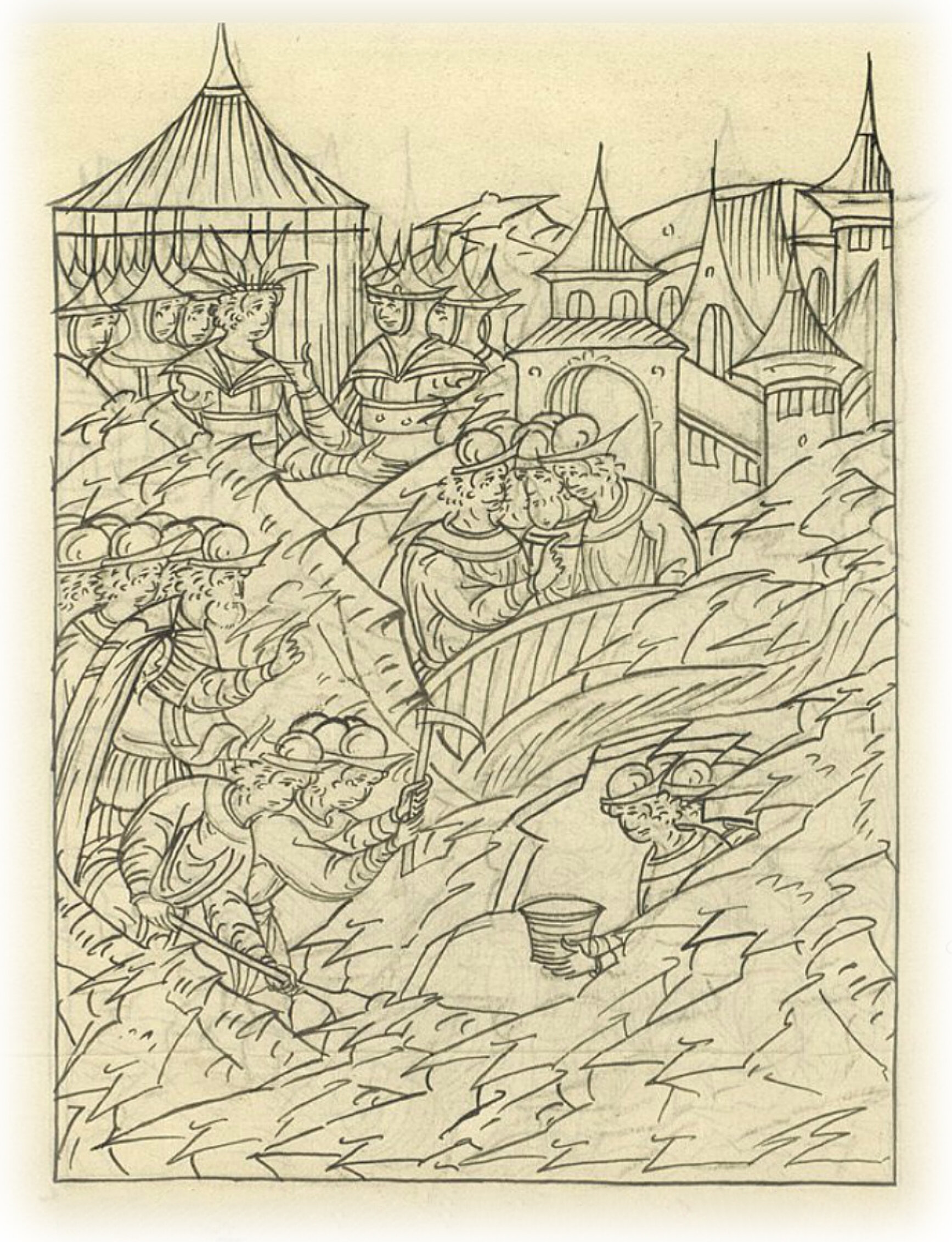 И боярин князь Василий Семенович, прося о том у Бога милости прилежно, и по царскому повелению позаботился об этом, (копали) день и ночь и в десять дней подкопались под мост, куда с водой ходят; и сам князь Василий с товарищами понял, когда голоса татарские услышал, что уже через них с водою ходят, и известил об этом государя.