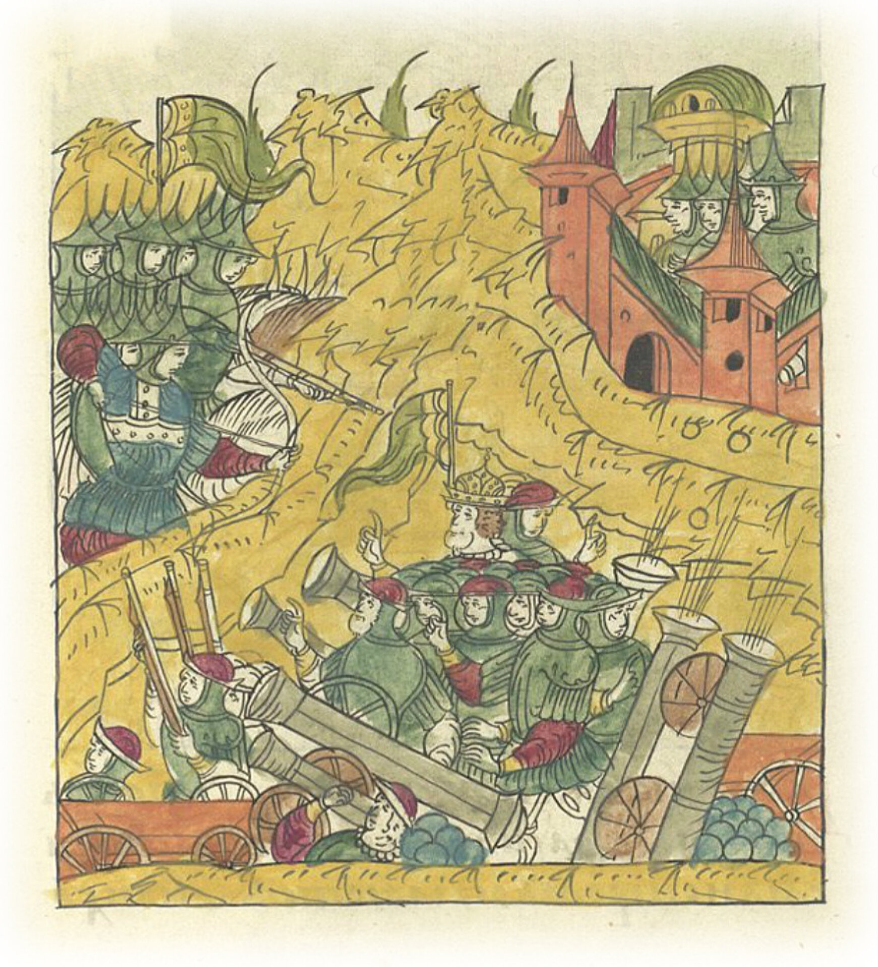 и воеводы к станам его приходят, и людей побивают, а магистр из станов бьет из пушек и пищалей, а к воеводам не едет, а приступает к Рынголу; а с воеводами же людей немного, да и те очень устали;
